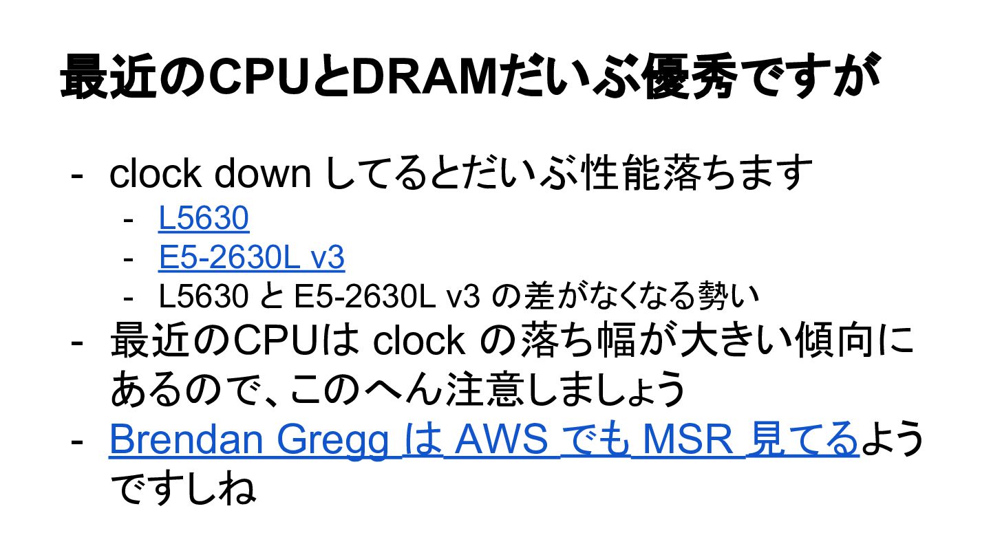 - L5630 と E5-2630L v3 の差がなくなる勢い - 最近のCPUは clock の落ち幅が大きい傾向に あるので、このへん注意しましょう - Brendan Gregg は AWS でも MSR 見てるよう ですしね