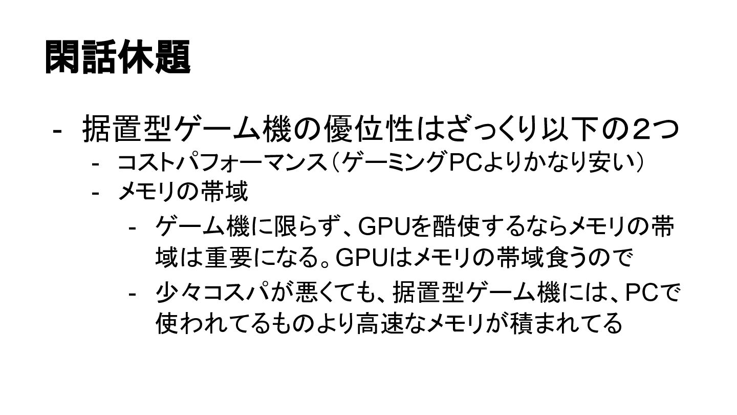 閑話休題 - 据置型ゲーム機の優位性はざっくり以下の2つ - コストパフォーマンス(ゲーミングPCよりかなり安い) - メモリの帯域 - ゲーム機に限らず、GPUを酷使するならメモリの帯 域は重要になる。GPUはメモリの帯域食うので
