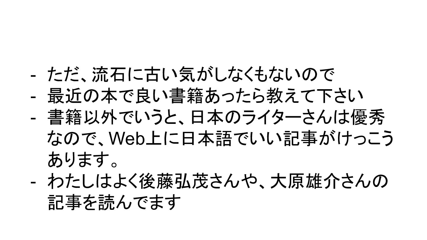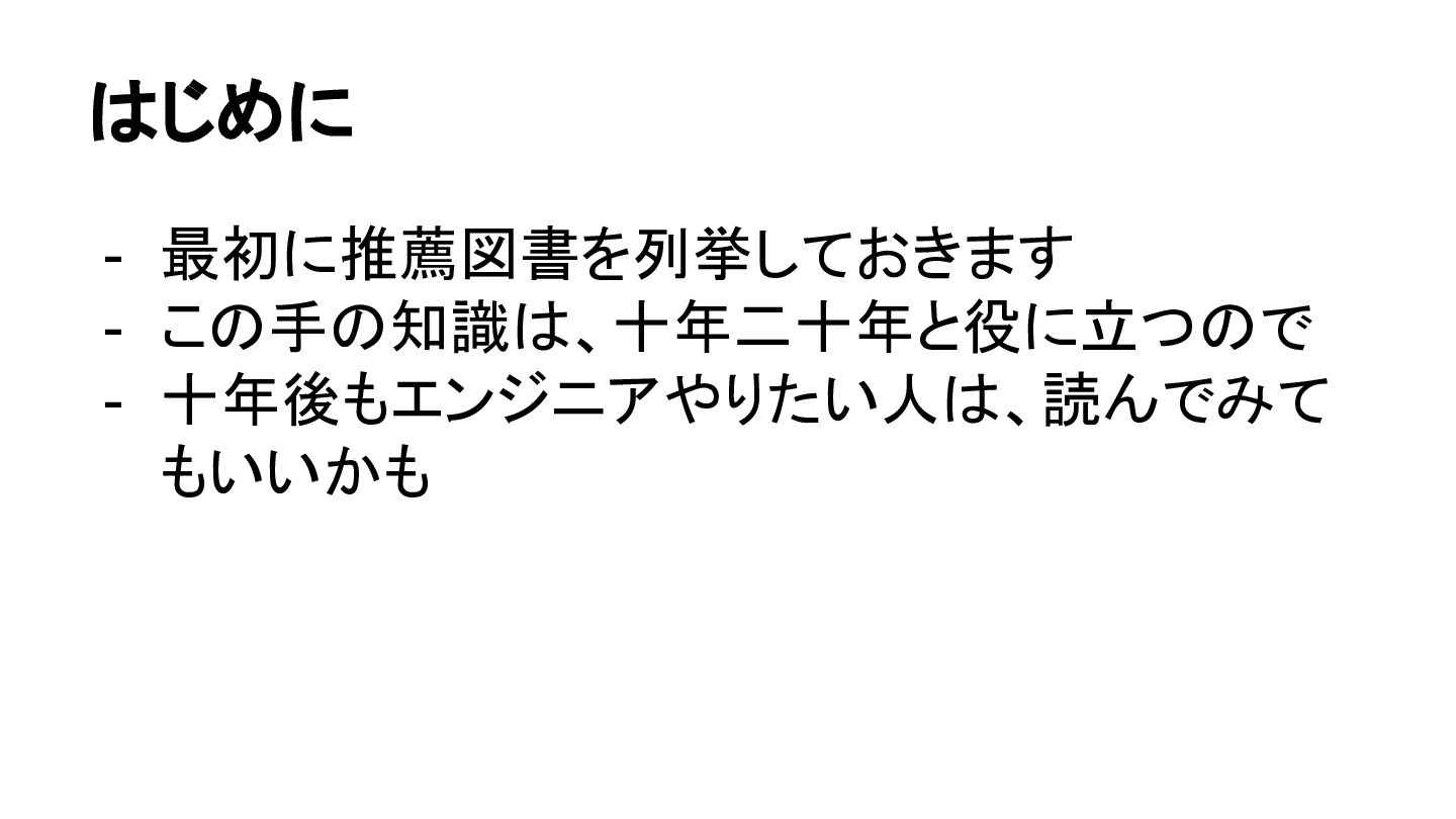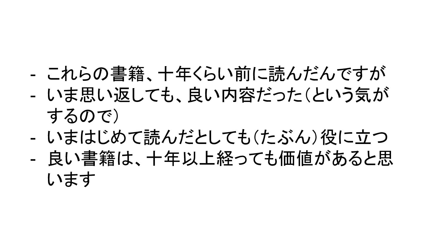 - これらの書籍、十年くらい前に読んだんですが - いま思い返しても、良い内容だった(という気が するので) - いまはじめて読んだとしても(たぶん)役に立つ - 良い書籍は、十年以上経っても価値があると思 います