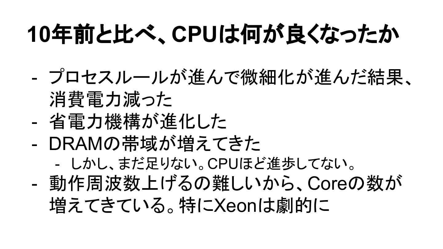 10年前と比べ、CPUは何が良くなったか - プロセスルールが進んで微細化が進んだ結果、 消費電力減った - 省電力機構が進化した - DRAMの帯域が増えてきた - しかし、まだ足りない。CPUほど進歩してない。