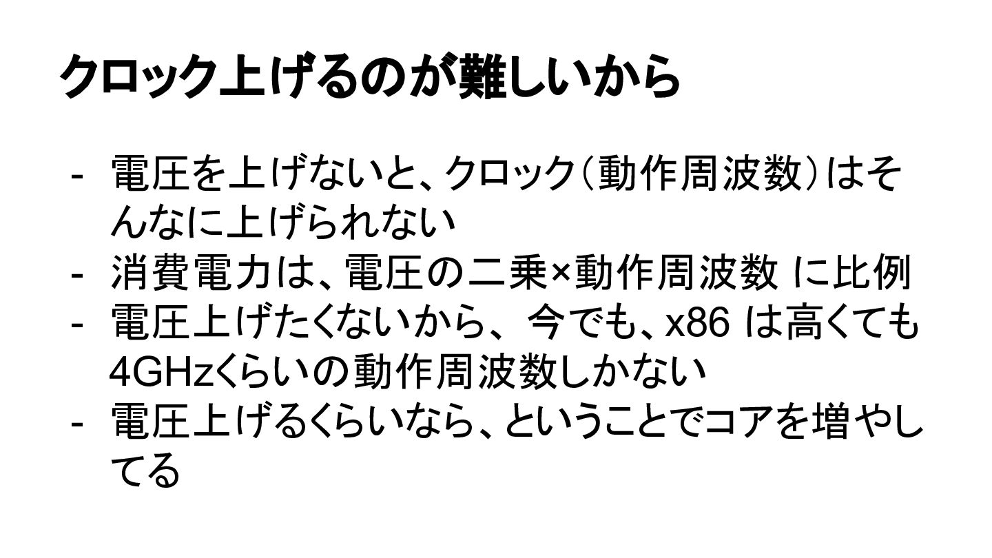 クロック上げるのが難しいから - 電圧を上げないと、クロック(動作周波数)はそ んなに上げられない - 消費電力は、電圧の二乗×動作周波数 に比例 - 電圧上げたくないから、 今でも、x86