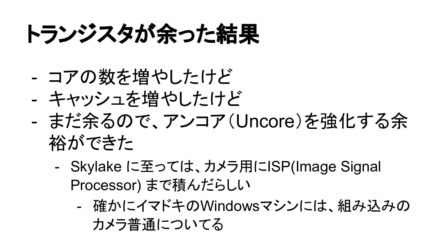 トランジスタが余った結果 - コアの数を増やしたけど - キャッシュを増やしたけど - まだ余るので、アンコア(Uncore)を強化する余 裕ができた - Skylake