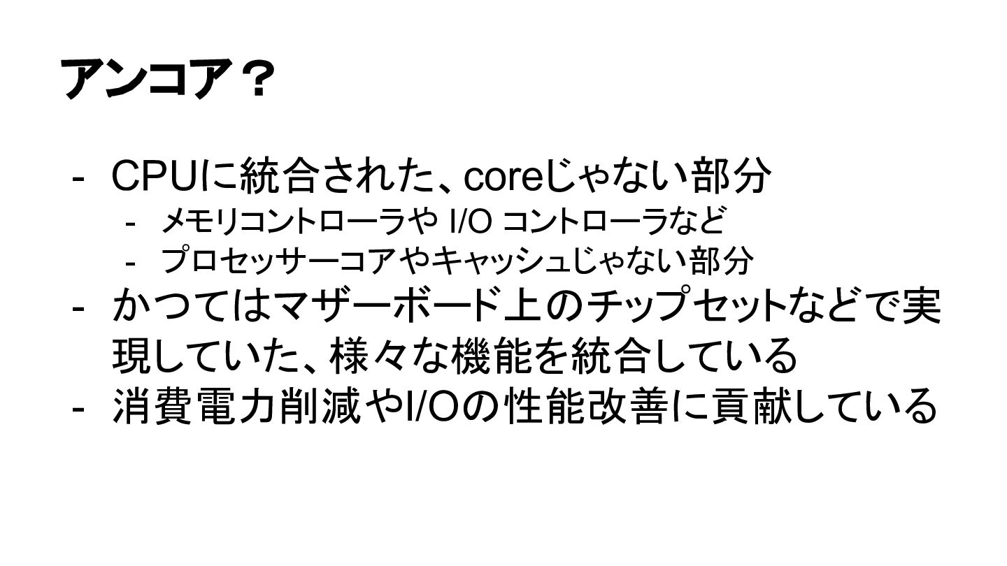 アンコア? - CPUに統合された、coreじゃない部分 - メモリコントローラや I/O コントローラなど - プロセッサーコアやキャッシュじゃない部分 -