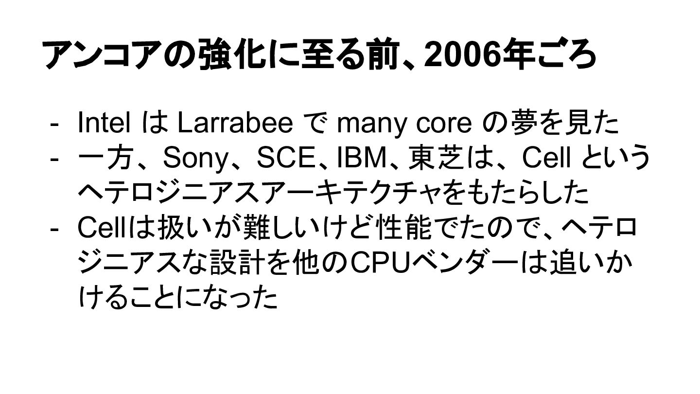 一方、 Sony、 SCE、IBM、東芝は、 Cell という ヘテロジニアスアーキテクチャをもたらした - Cellは扱いが難しいけど性能でたので、ヘテロ ジニアスな設計を他のCPUベンダーは追いか けることになった