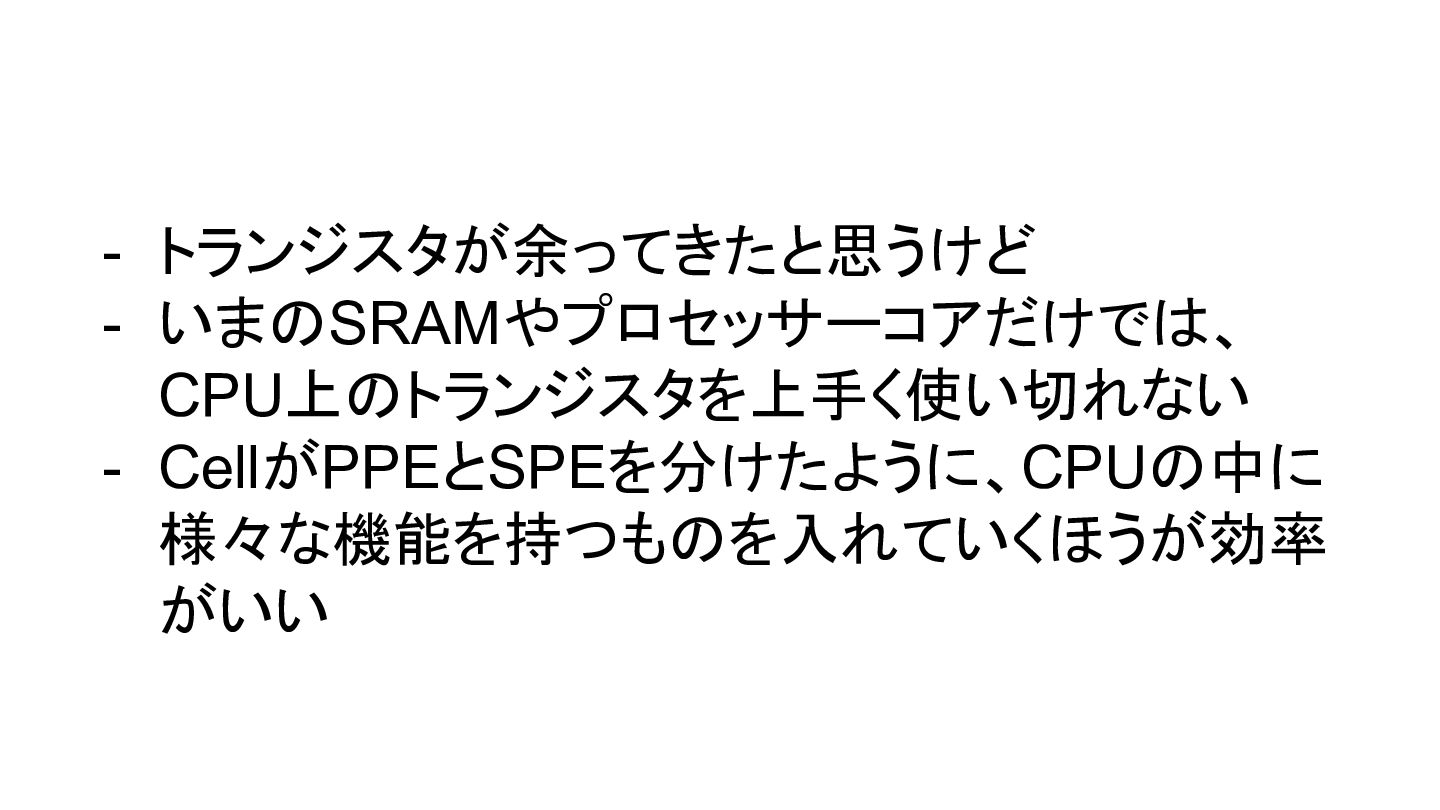- トランジスタが余ってきたと思うけど - いまのSRAMやプロセッサーコアだけでは、 CPU上のトランジスタを上手く使い切れない - CellがPPEとSPEを分けたように、CPUの中に 様々な機能を持つものを入れていくほうが効率 がいい