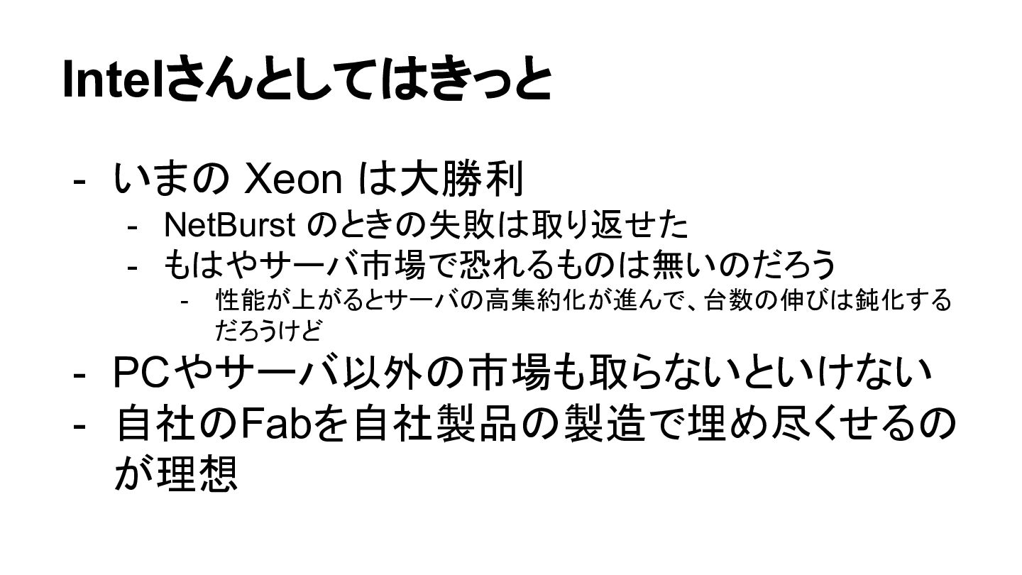 - 性能が上がるとサーバの高集約化が進んで、台数の伸びは鈍化する だろうけど - PCやサーバ以外の市場も取らないといけない - 自社のFabを自社製品の製造で埋め尽くせるの が理想