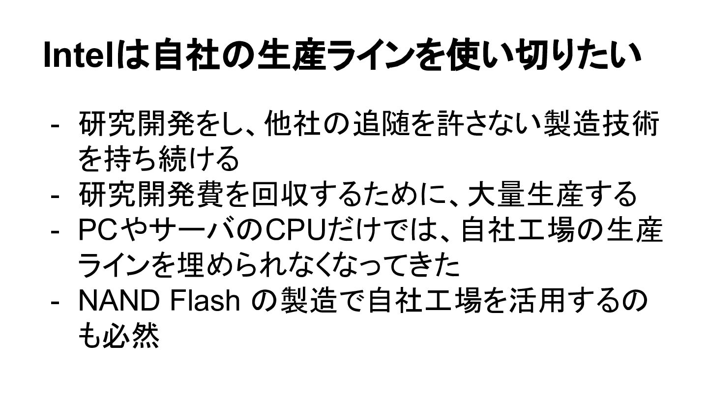 Intelは自社の生産ラインを使い切りたい - 研究開発をし、他社の追随を許さない製造技術 を持ち続ける - 研究開発費を回収するために、大量生産する - PCやサーバのCPUだけでは、自社工場の生産 ラインを埋められなくなってきた -