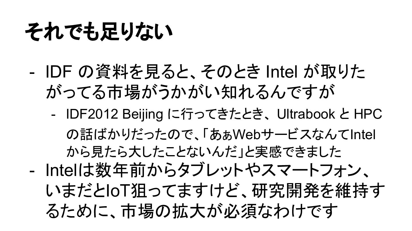 に行ってきたとき、 Ultrabook と HPC の話ばかりだったので、「あぁWebサービスなんてIntel から見たら大したことないんだ」と実感できました - Intelは数年前からタブレットやスマートフォン、 いまだとIoT狙ってますけど、研究開発を維持す るために、市場の拡大が必須なわけです