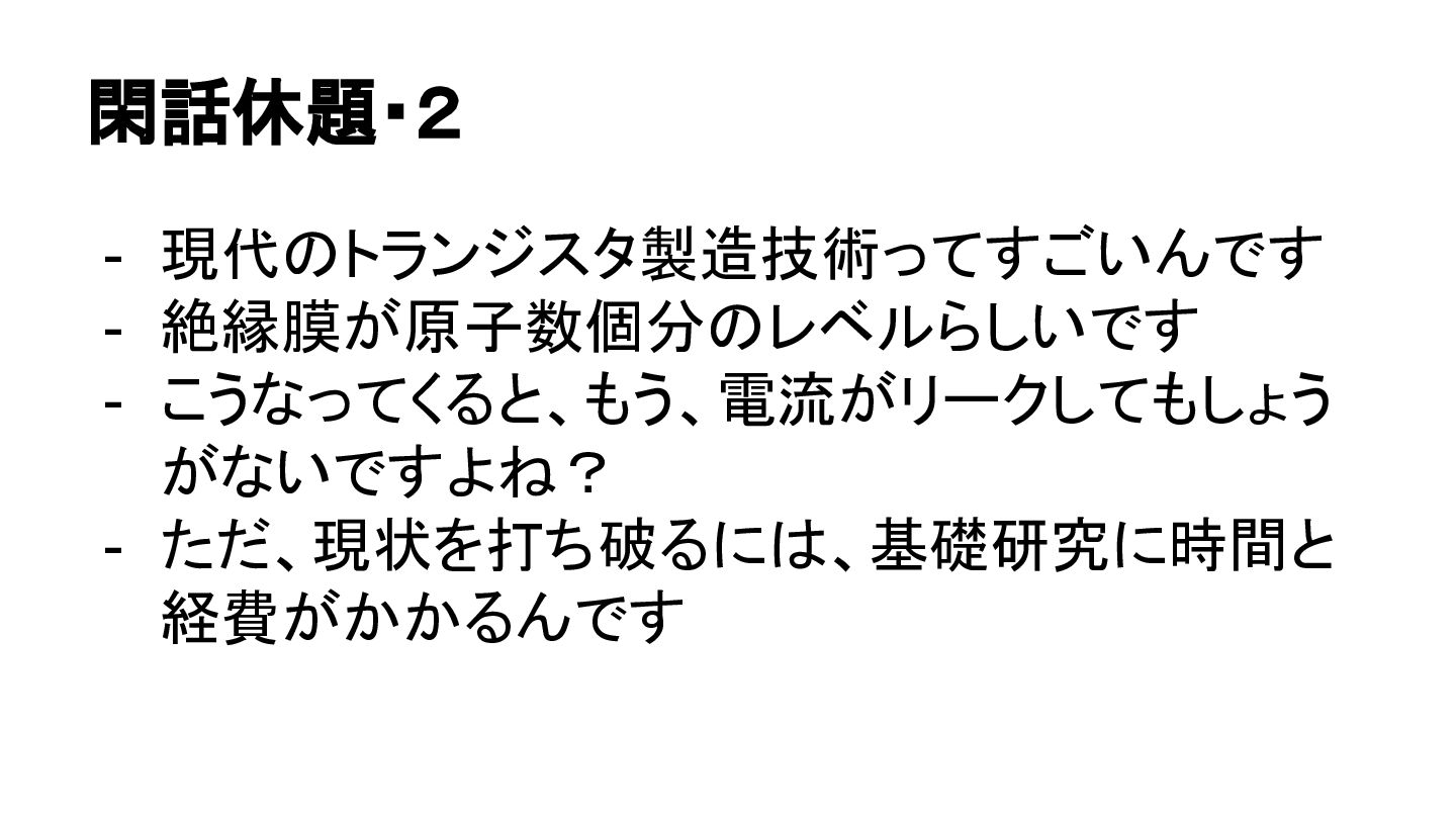 閑話休題・2 - 現代のトランジスタ製造技術ってすごいんです - 絶縁膜が原子数個分のレベルらしいです - こうなってくると、もう、電流がリークしてもしょう がないですよね? - ただ、現状を打ち破るには、基礎研究に時間と
