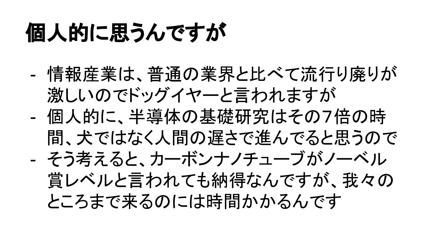 個人的に思うんですが - 情報産業は、普通の業界と比べて流行り廃りが 激しいのでドッグイヤーと言われますが - 個人的に、半導体の基礎研究はその7倍の時 間、犬ではなく人間の遅さで進んでると思うので - そう考えると、カーボンナノチューブがノーベル 賞レベルと言われても納得なんですが、我々の