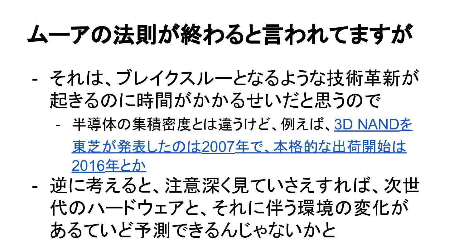ムーアの法則が終わると言われてますが - それは、ブレイクスルーとなるような技術革新が 起きるのに時間がかかるせいだと思うので - 半導体の集積密度とは違うけど、例えば、3D NANDを 東芝が発表したのは2007年で、本格的な出荷開始は 2016年とか -