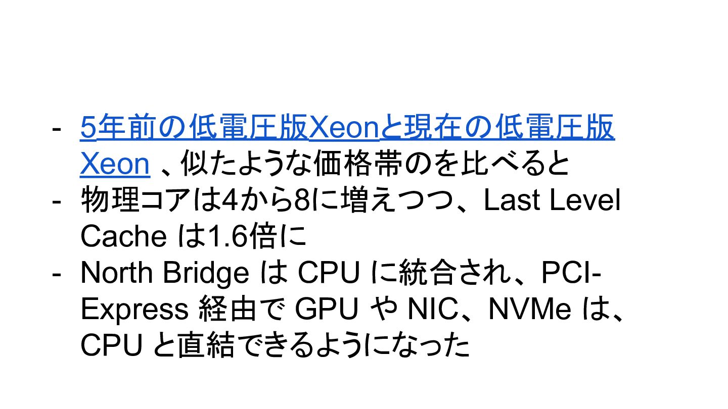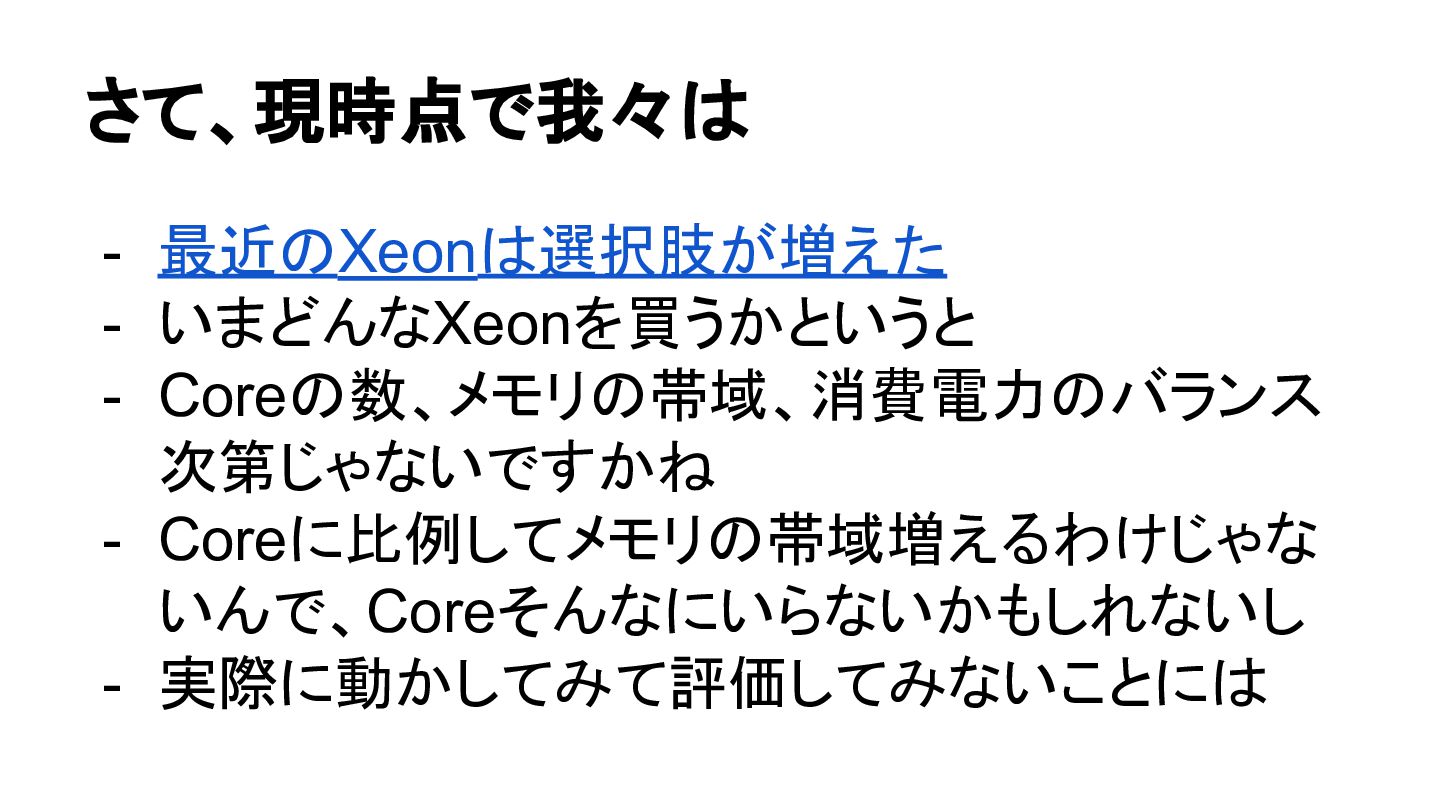 さて、現時点で我々は - 最近のXeonは選択肢が増えた - いまどんなXeonを買うかというと - Coreの数、メモリの帯域、消費電力のバランス 次第じゃないですかね - Coreに比例してメモリの帯域増えるわけじゃな