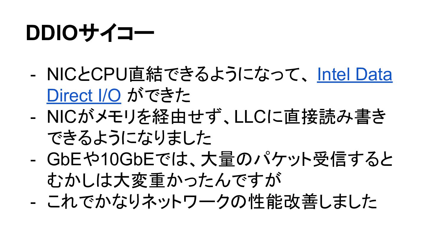 DDIOサイコー - NICとCPU直結できるようになって、 Intel Data Direct I/O ができた - NICがメモリを経由せず、LLCに直接読み書き