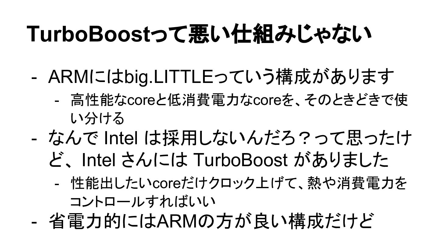 TurboBoostって悪い仕組みじゃない - ARMにはbig.LITTLEっていう構成があります - 高性能なcoreと低消費電力なcoreを、そのときどきで使 い分ける - なんで Intel は採用しないんだろ?って思ったけ