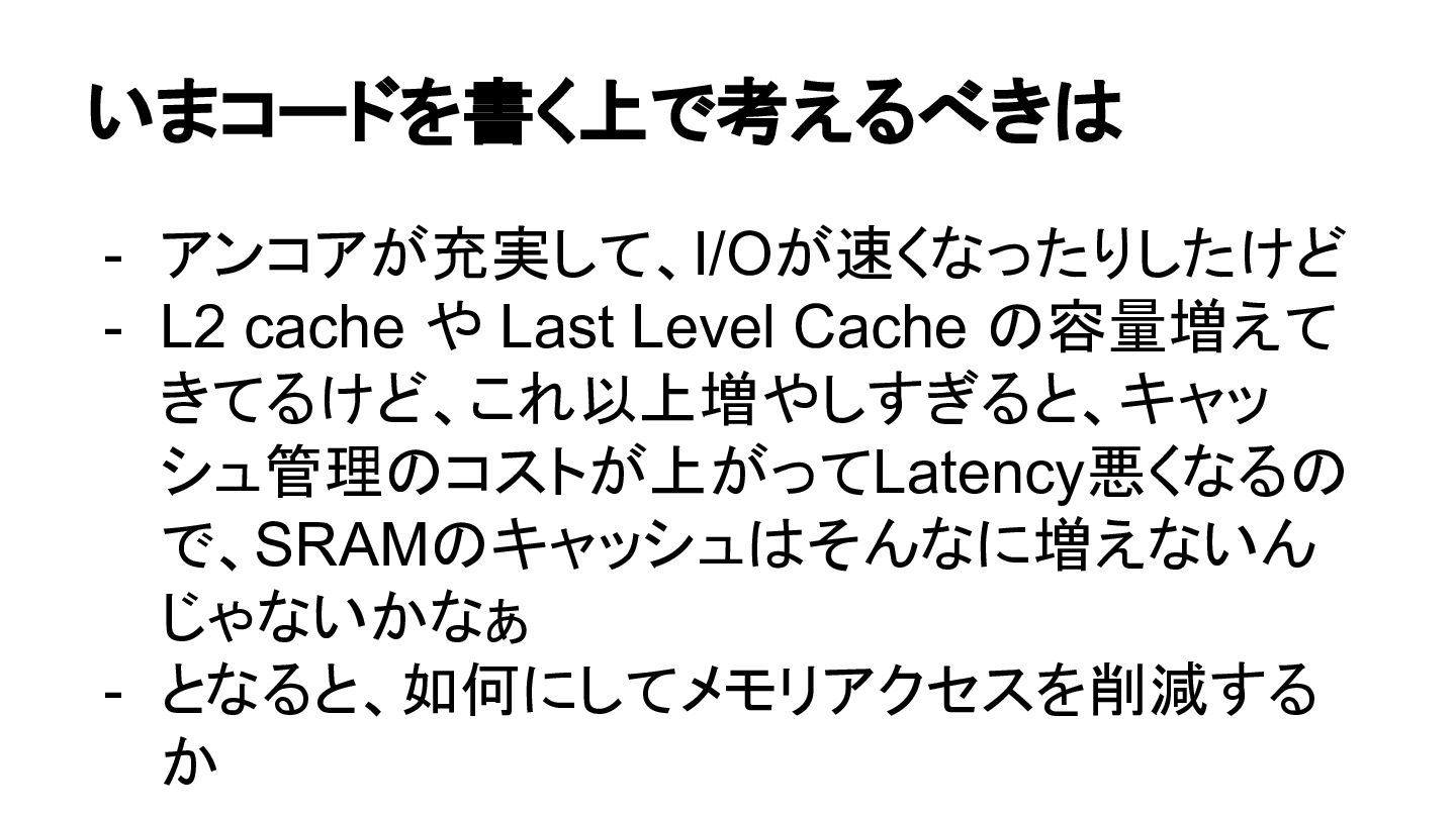 いまコードを書く上で考えるべきは - アンコアが充実して、I/Oが速くなったりしたけど - L2 cache や Last Level Cache