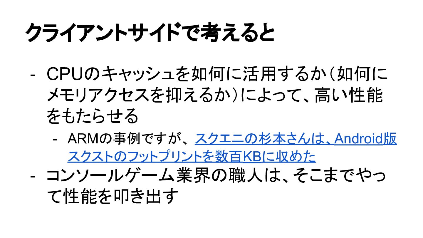 クライアントサイドで考えると - CPUのキャッシュを如何に活用するか(如何に メモリアクセスを抑えるか)によって、高い性能 をもたらせる - ARMの事例ですが、 スクエニの杉本さんは、Android版 スクストのフットプリントを数百KBに収めた -