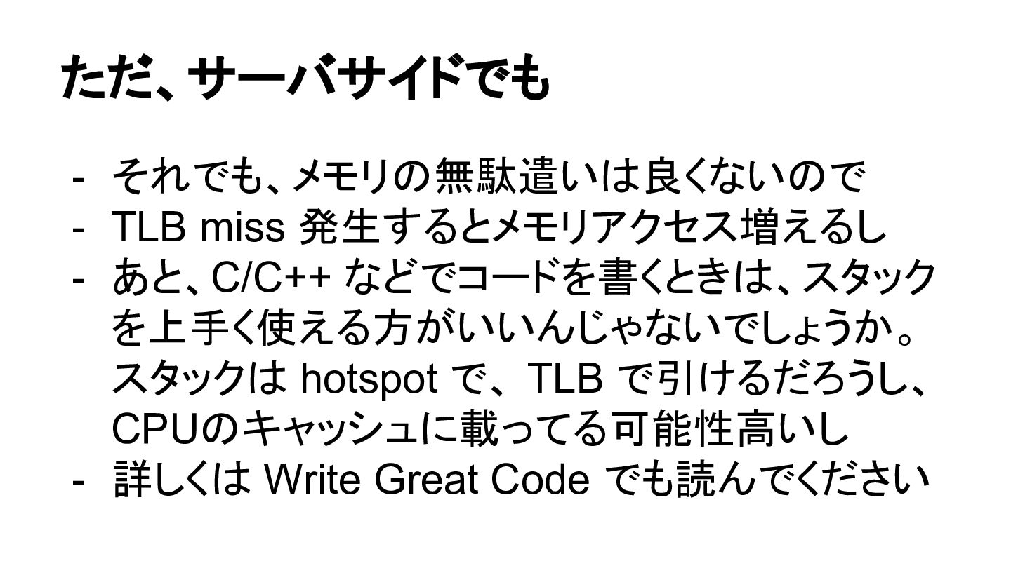 ただ、サーバサイドでも - それでも、メモリの無駄遣いは良くないので - TLB miss 発生するとメモリアクセス増えるし - あと、C/C++ などでコードを書くときは、スタック