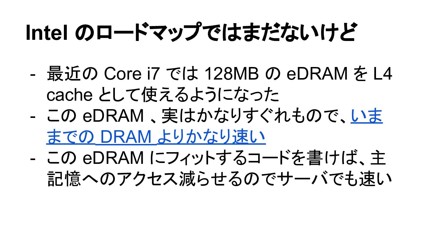 を L4 cache として使えるようになった - この eDRAM 、実はかなりすぐれもので、いま までの DRAM よりかなり速い - この eDRAM にフィットするコードを書けば、主 記憶へのアクセス減らせるのでサーバでも速い
