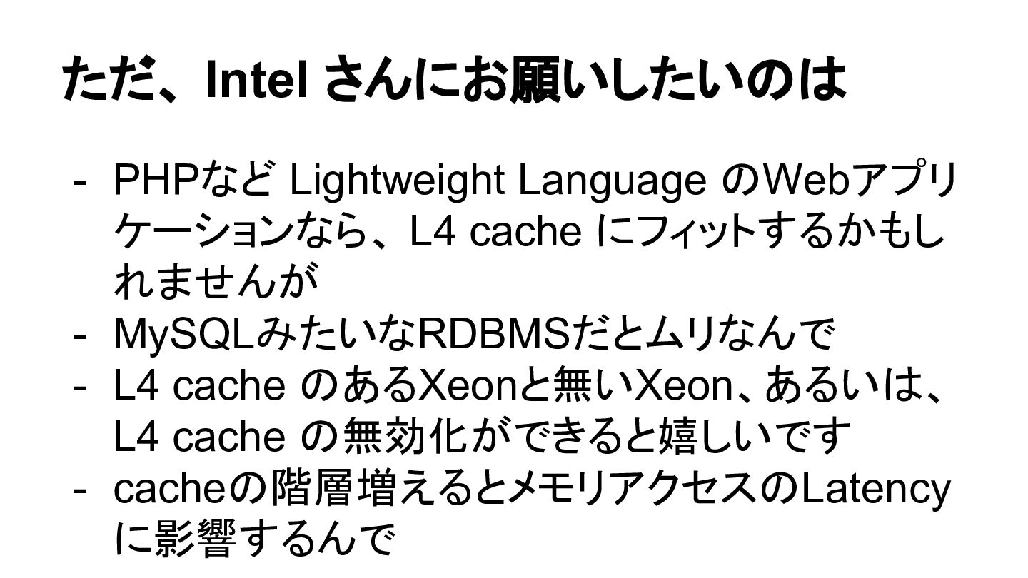 cache にフィットするかもし れませんが - MySQLみたいなRDBMSだとムリなんで - L4 cache のあるXeonと無いXeon、あるいは、 L4 cache の無効化ができると嬉しいです - cacheの階層増えるとメモリアクセスのLatency に影響するんで