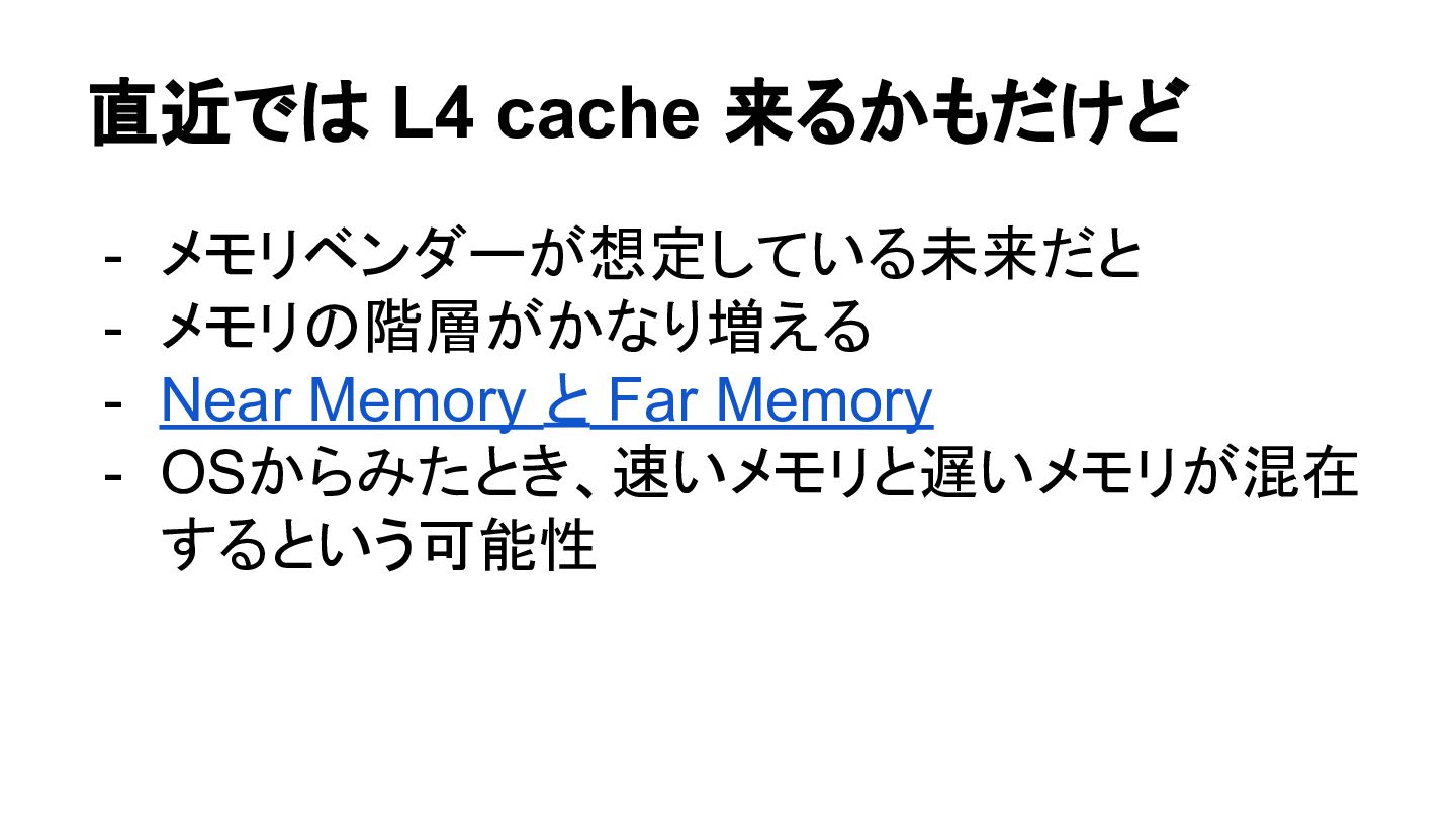 直近では L4 cache 来るかもだけど - メモリベンダーが想定している未来だと - メモリの階層がかなり増える - Near