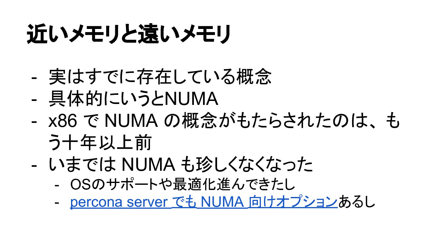 も う十年以上前 - いまでは NUMA も珍しくなくなった - OSのサポートや最適化進んできたし - percona server でも NUMA 向けオプションあるし