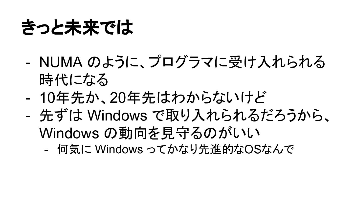 きっと未来では - NUMA のように、プログラマに受け入れられる 時代になる - 10年先か、20年先はわからないけど - 先ずは Windows