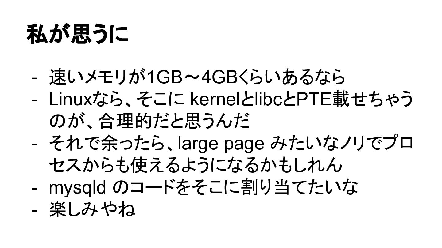 私が思うに - 速いメモリが1GB~4GBくらいあるなら - Linuxなら、そこに kernelとlibcとPTE載せちゃう のが、合理的だと思うんだ - それで余ったら、large page