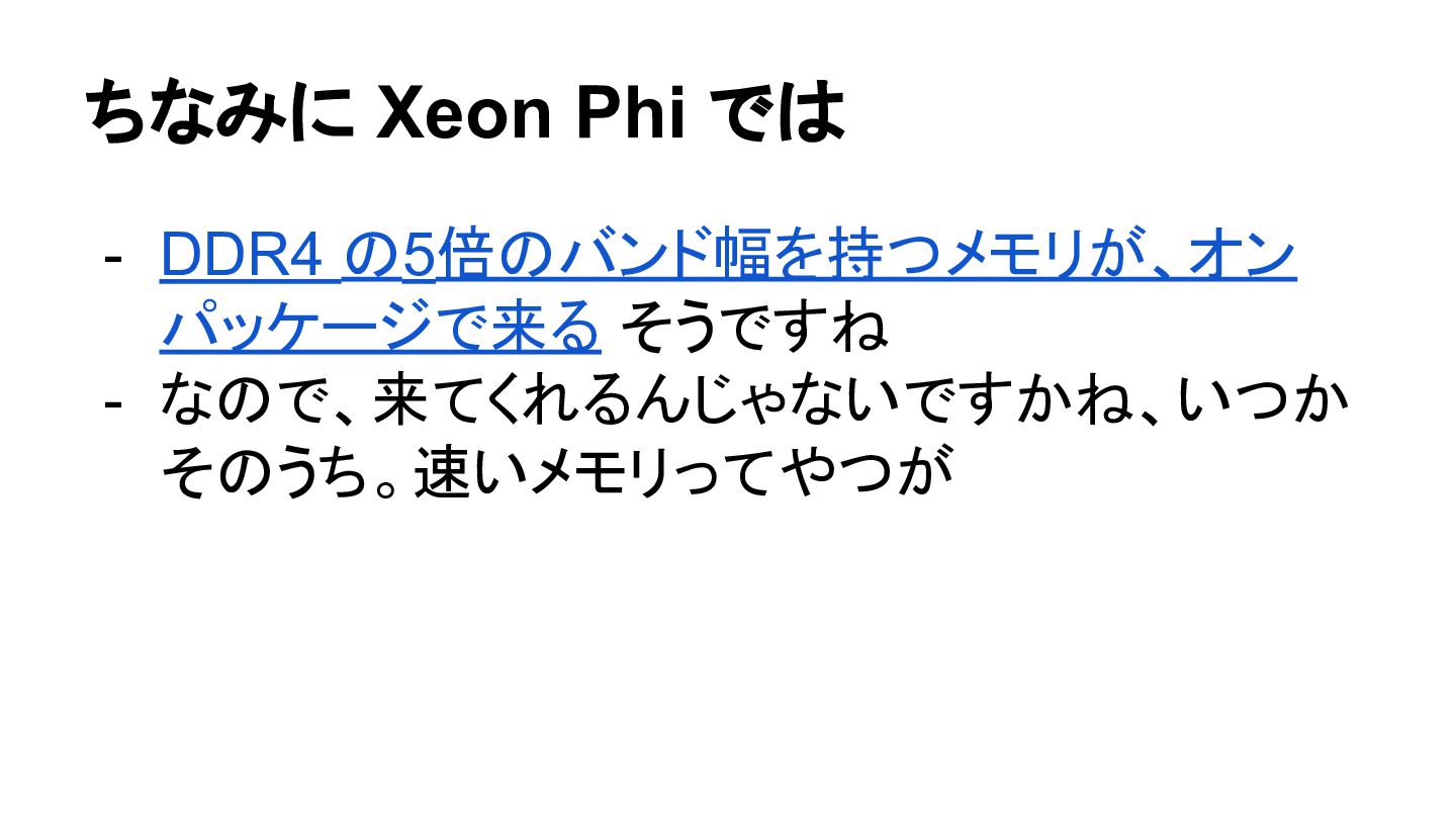 ちなみに Xeon Phi では - DDR4 の5倍のバンド幅を持つメモリが、オン パッケージで来る そうですね -