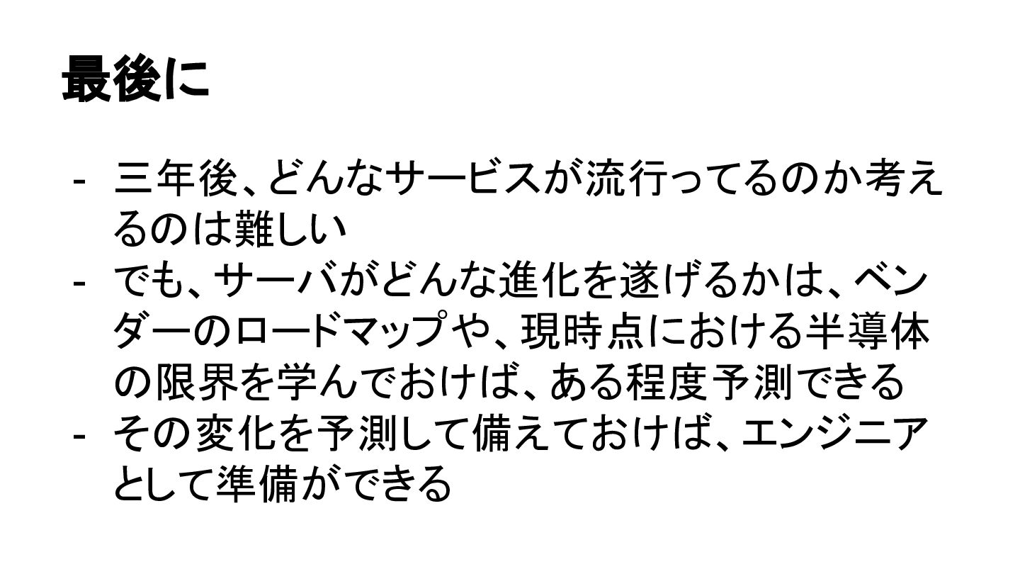 最後に - 三年後、どんなサービスが流行ってるのか考え るのは難しい - でも、サーバがどんな進化を遂げるかは、ベン ダーのロードマップや、現時点における半導体 の限界を学んでおけば、ある程度予測できる - その変化を予測して備えておけば、エンジニア