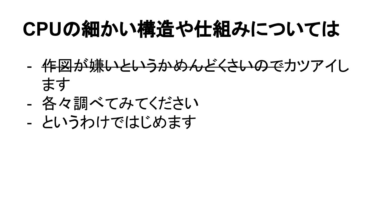 CPUの細かい構造や仕組みについては - 作図が嫌いというかめんどくさいのでカツアイし ます - 各々調べてみてください - というわけではじめます
