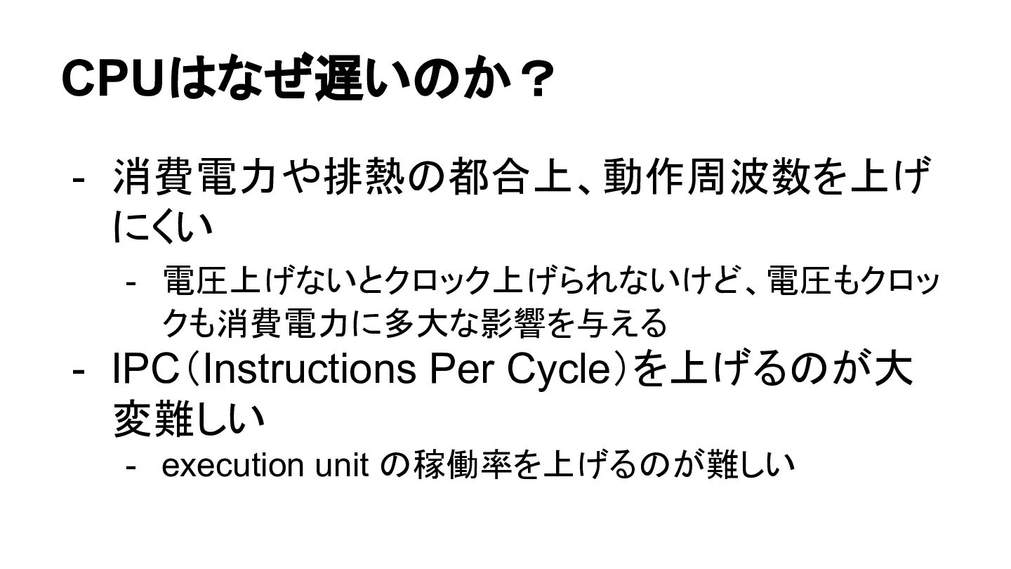 CPUはなぜ遅いのか? - 消費電力や排熱の都合上、動作周波数を上げ にくい - 電圧上げないとクロック上げられないけど、電圧もクロッ クも消費電力に多大な影響を与える - IPC(Instructions Per