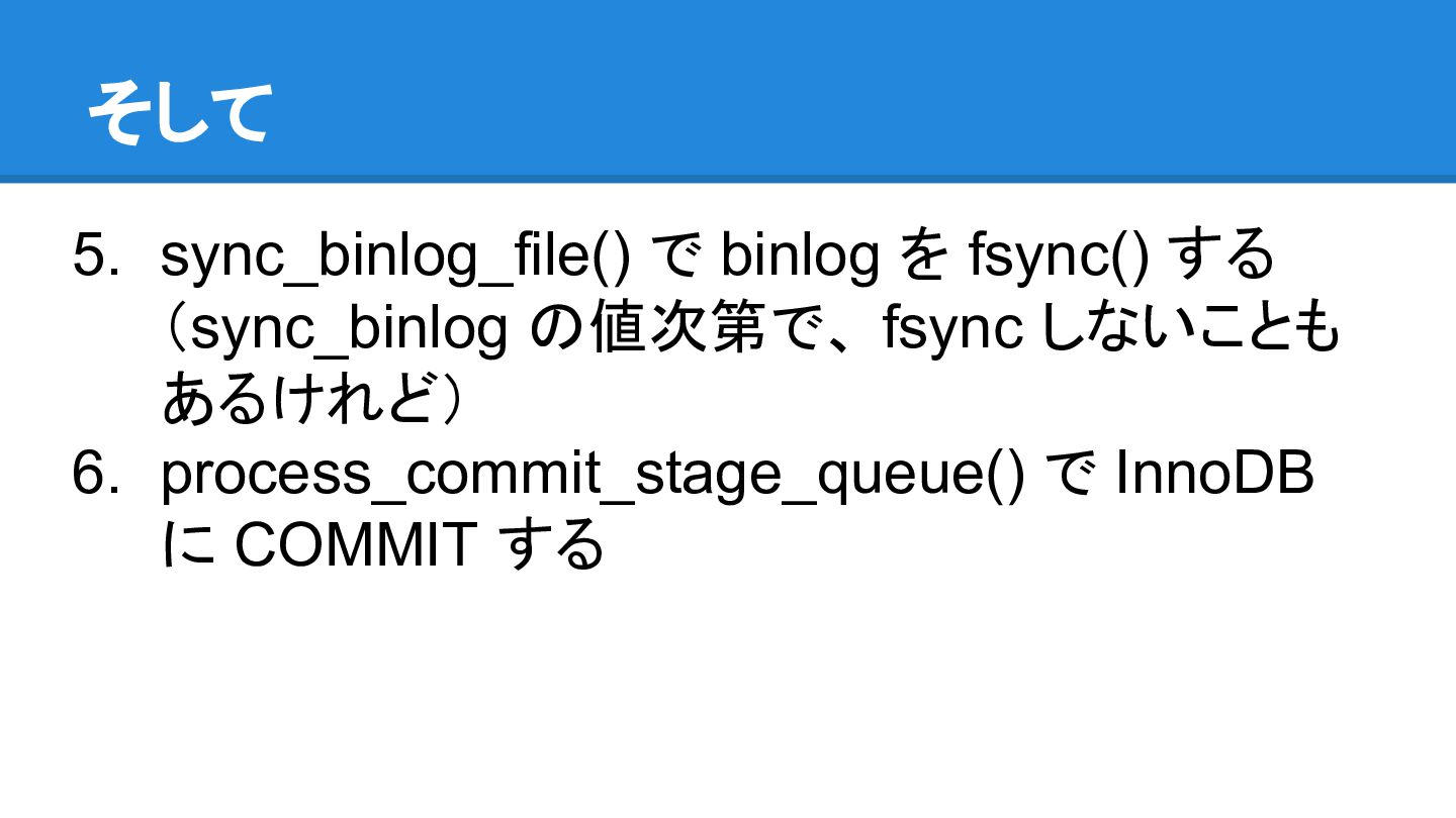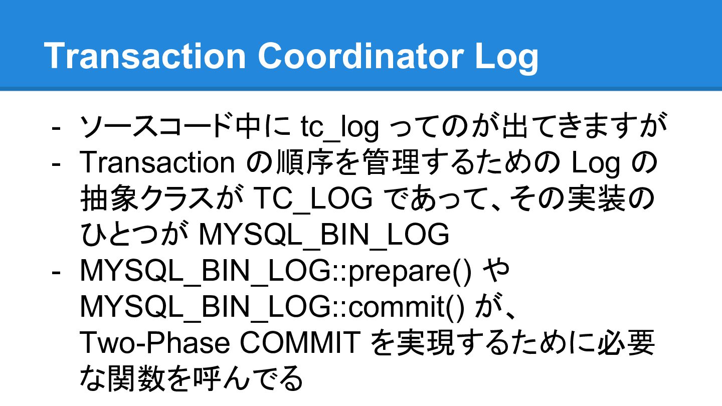 のクラッシュリカバリ機能と binlog のクラッシュリカバリ機能とが組み合わ さって、実現されてるようです - binlog のヘッダには open するときに立てて close する ときにリセットするフラグがあるので、正常に close した か(クラッシュしてないか)は、フラグをみて判断してます