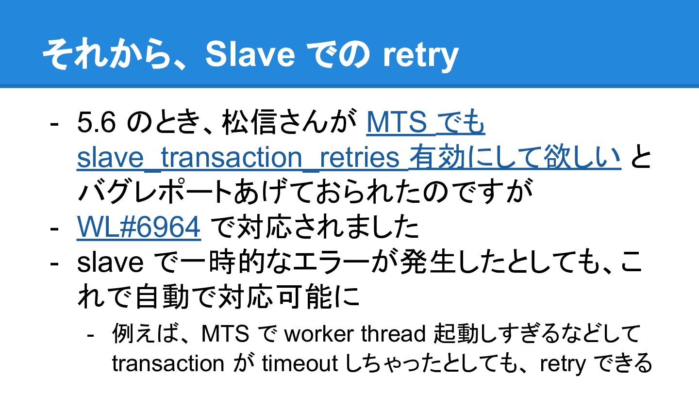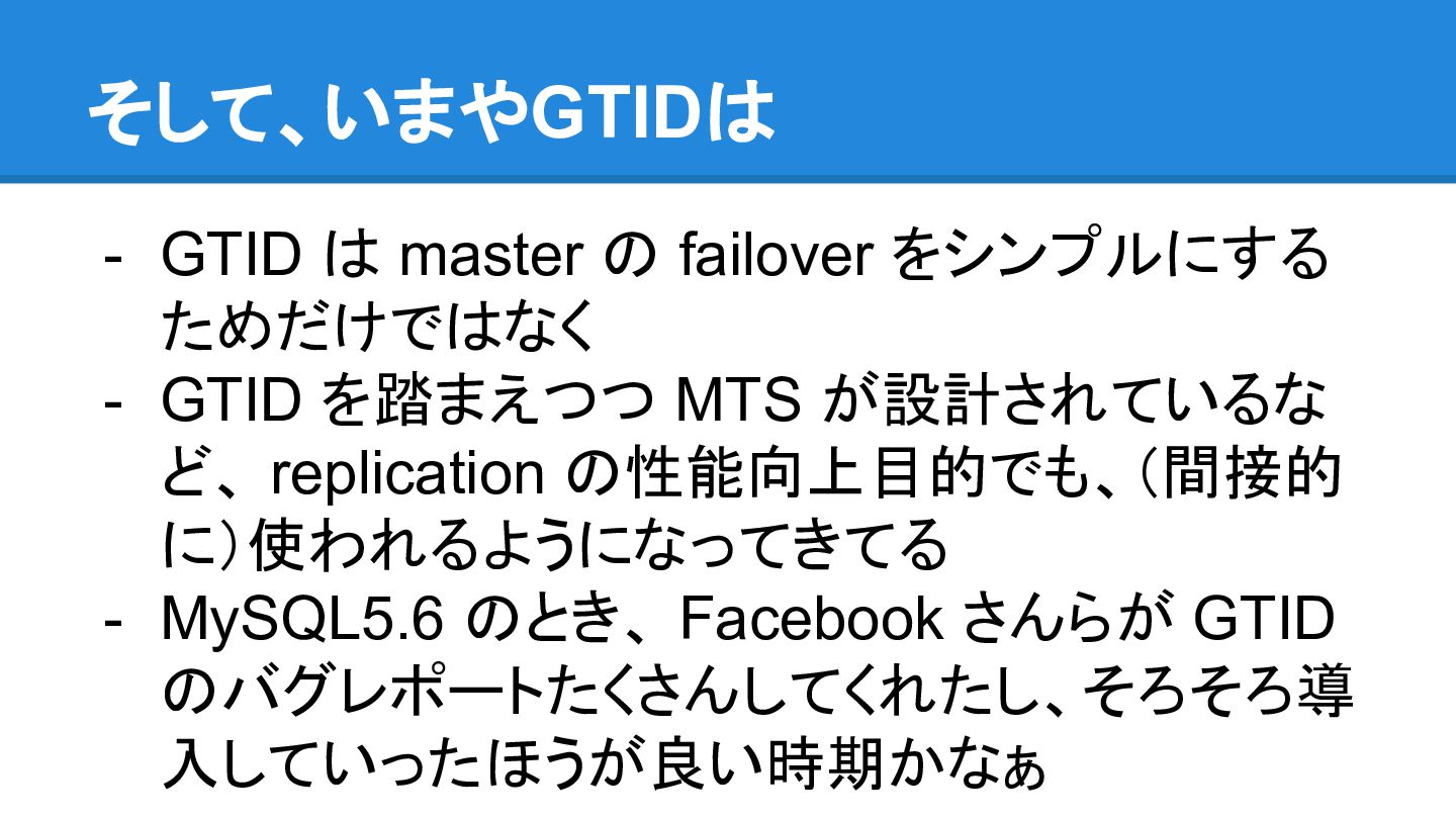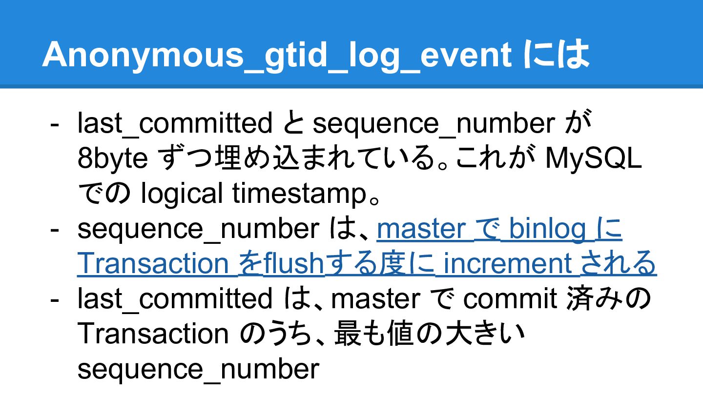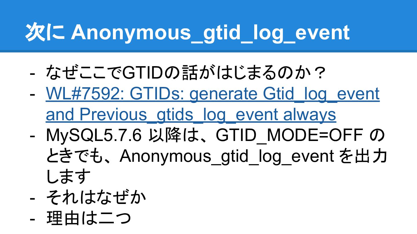 a per-transaction event also when GTID_MODE = OFF; this is needed e.g. for WL#7083 and WL#7165. - WL#7083は、GTIDをオンラインで有効化する ための修正らしいです。 - なるほどGTIDのためならしょうがない