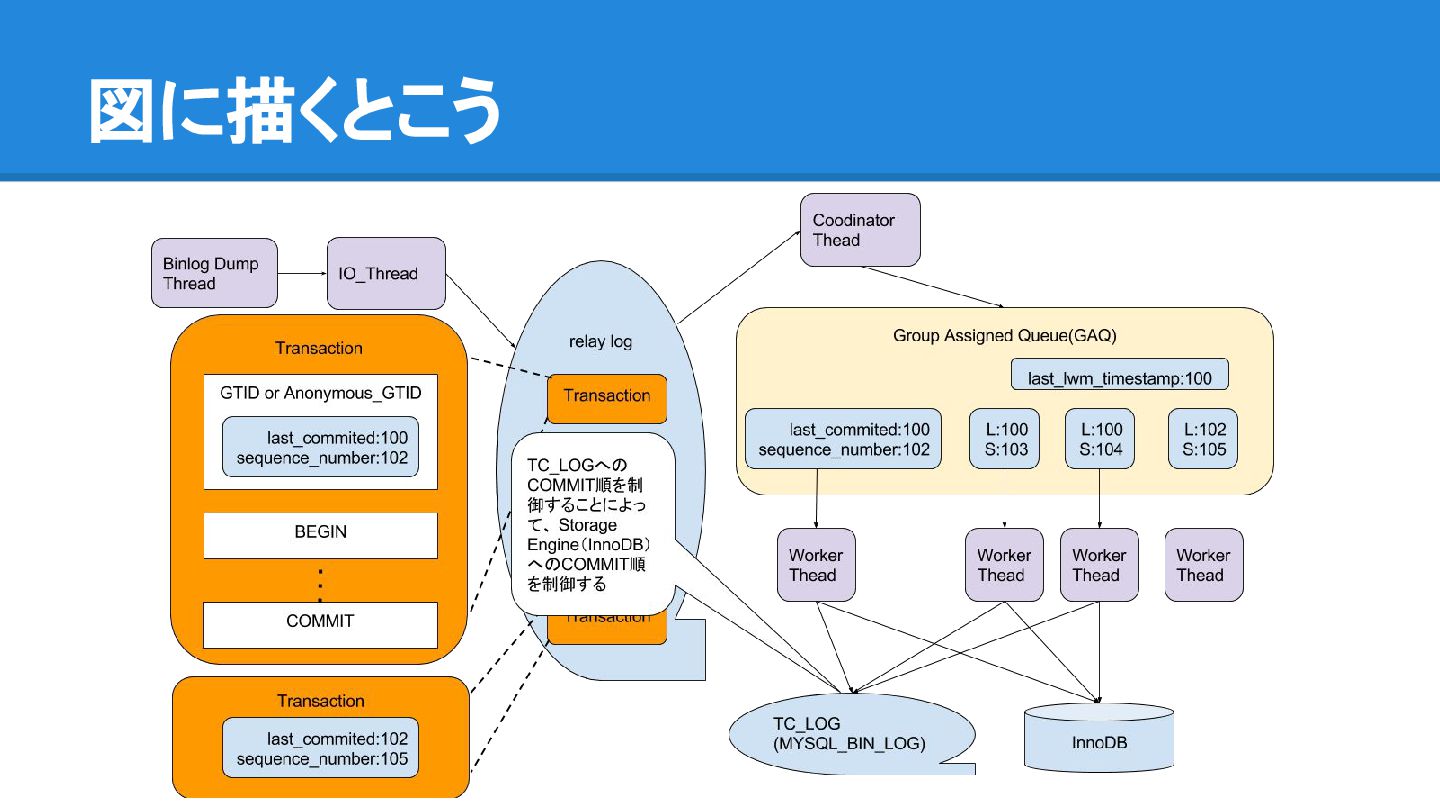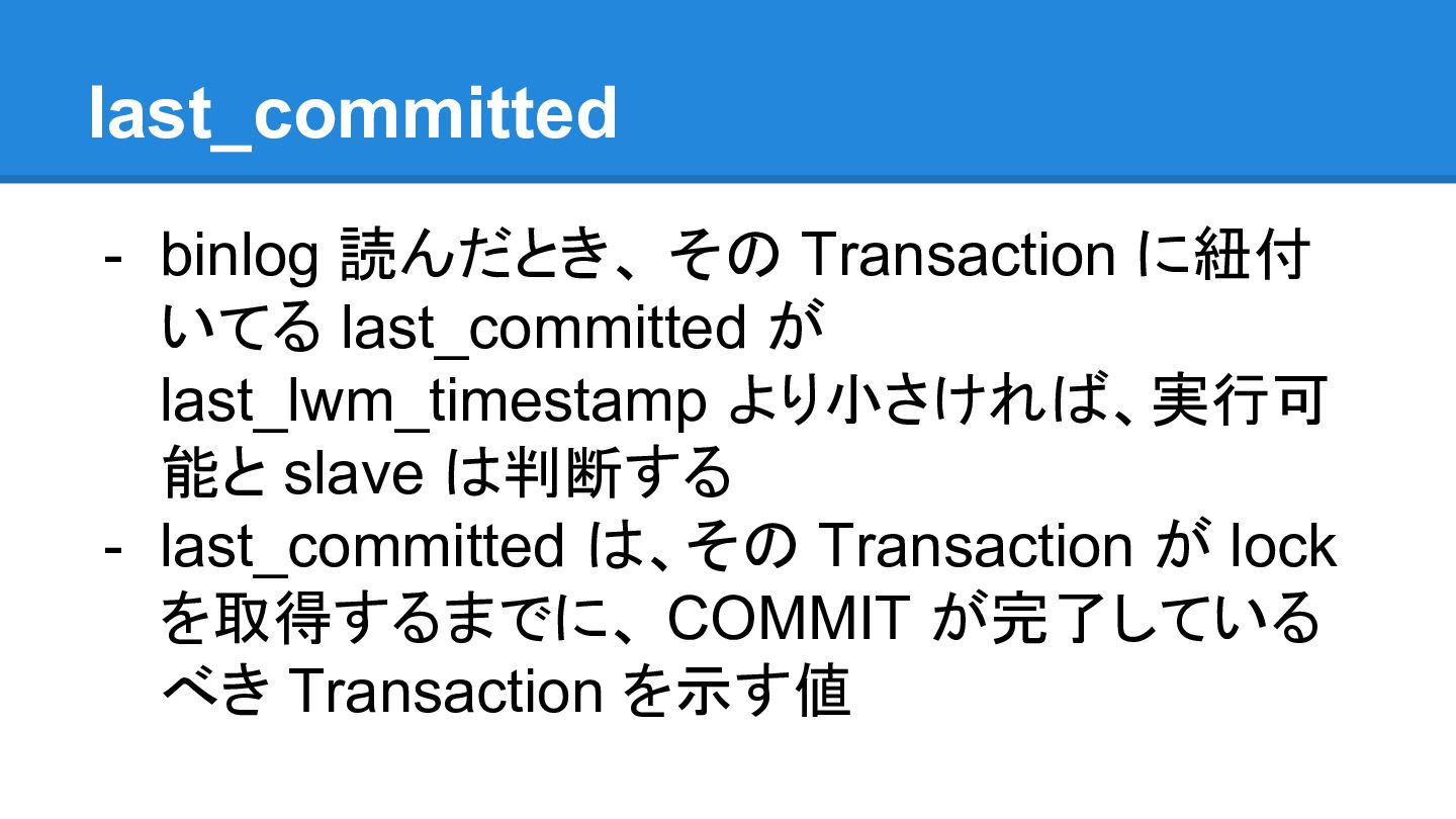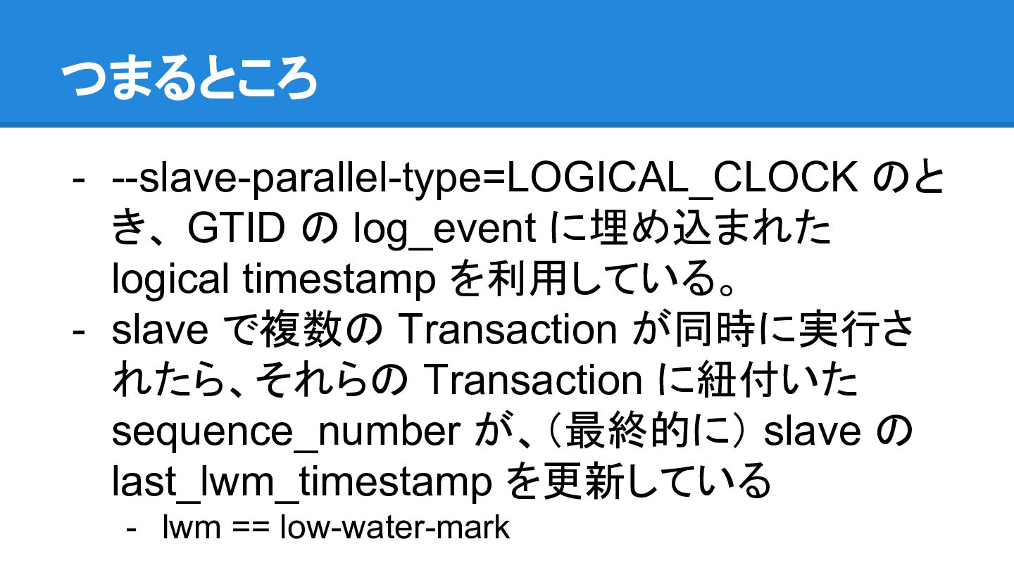 be enabled - On slave - binlog_order_commits should be enabled - binary log should be enabled - log_slave_update should be enabled - slave_preserve_commit_order should be enabled - そして LOGICAL_CLOCK 必須