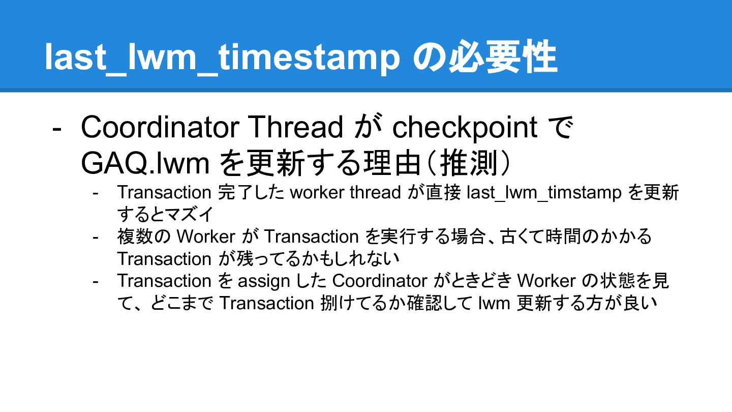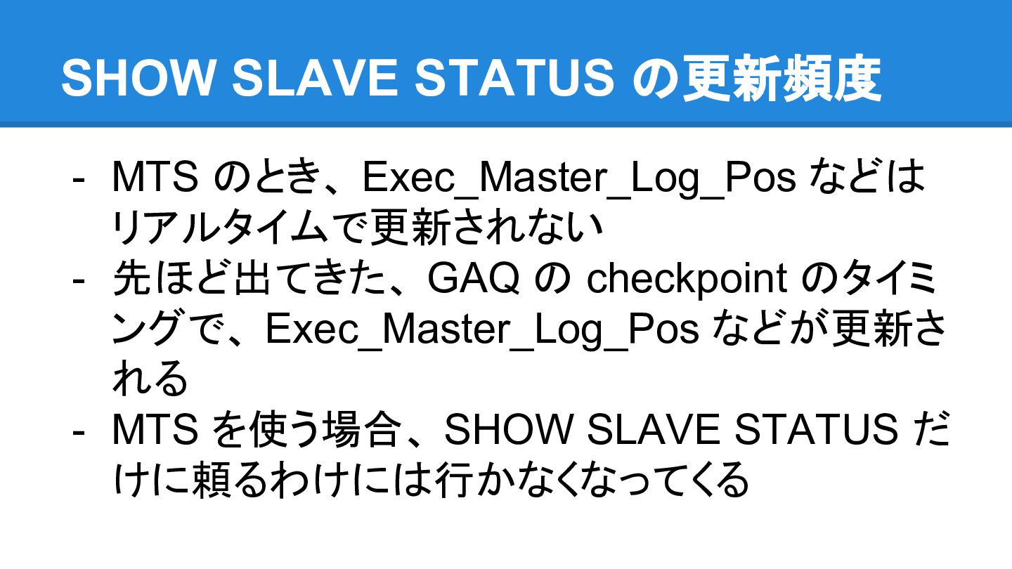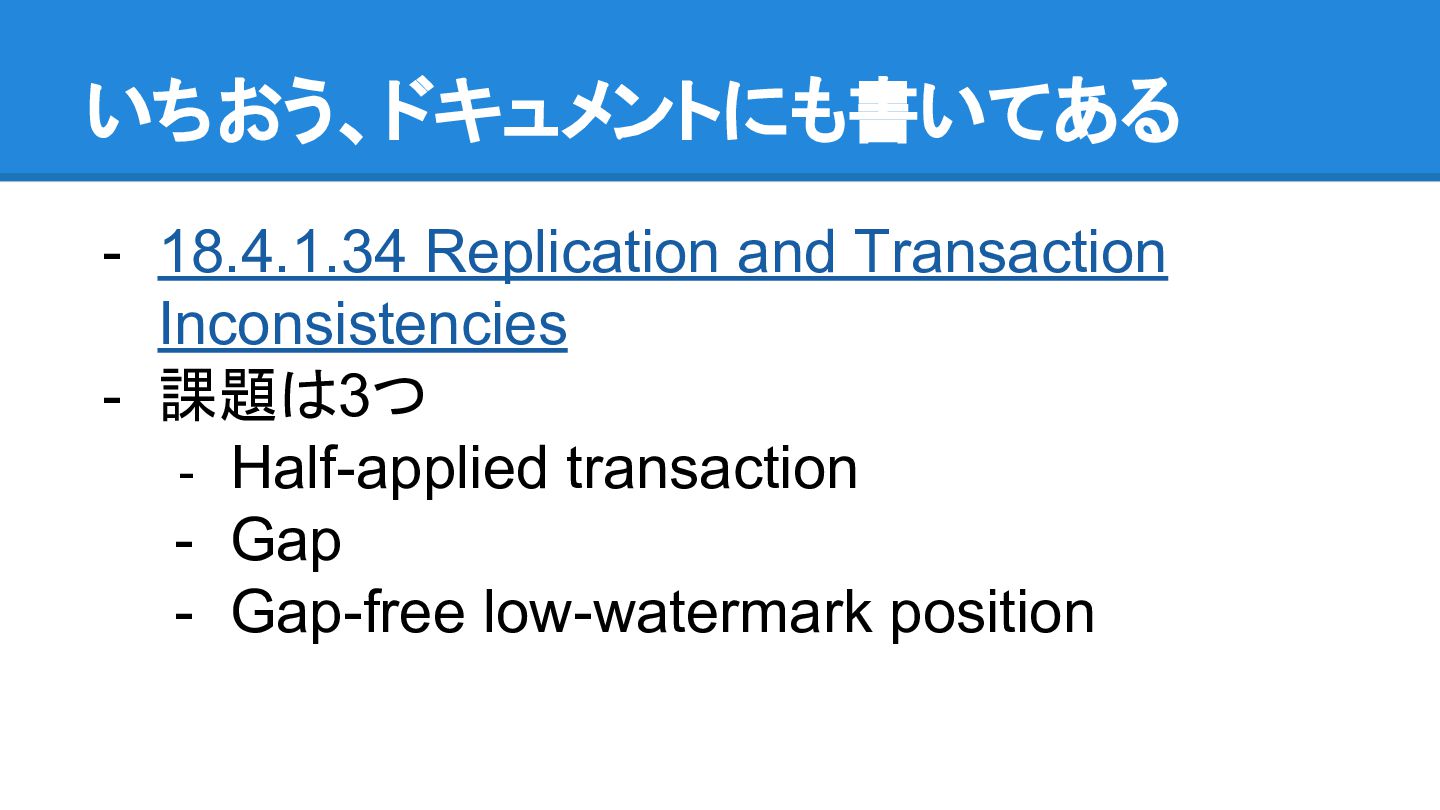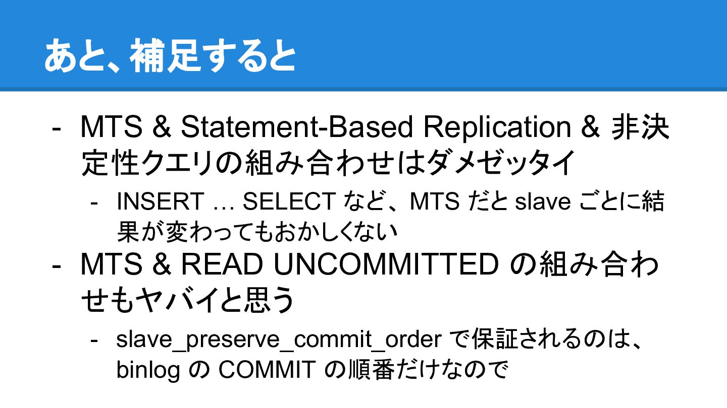 ごとに異なる状態が見えてしまう - 例えば、 master で Table A, Table B という二 つのTable にそれぞれ Record X, Record Yが 別々の Transaction から INSERT されたとき - X しか見えない slave と、 Y しか見えない slave が存在しうることになる