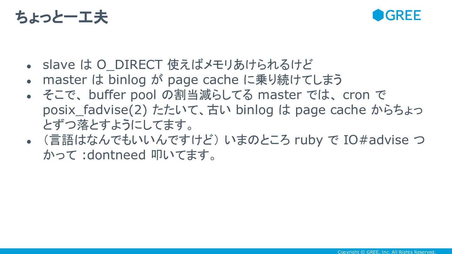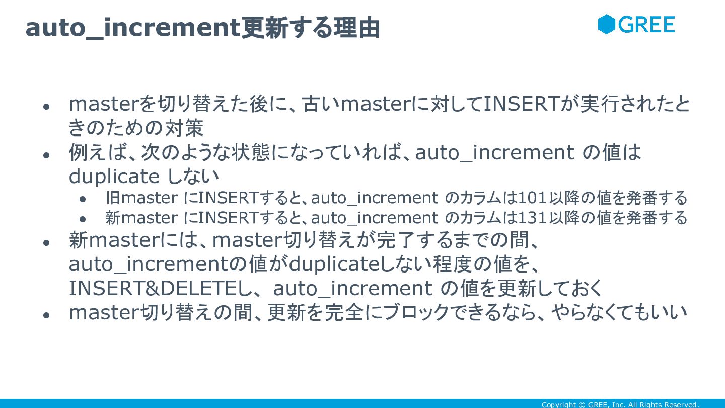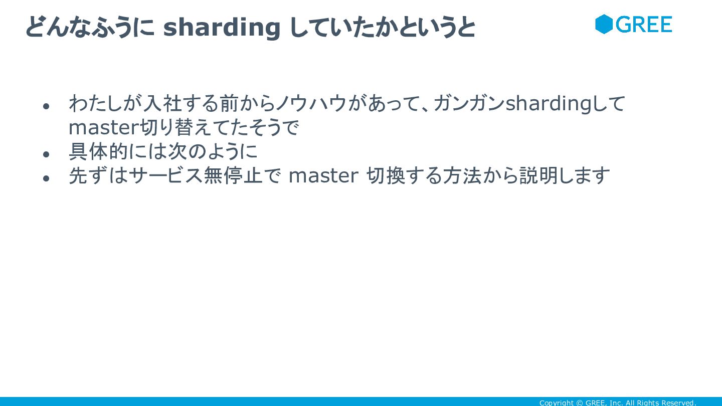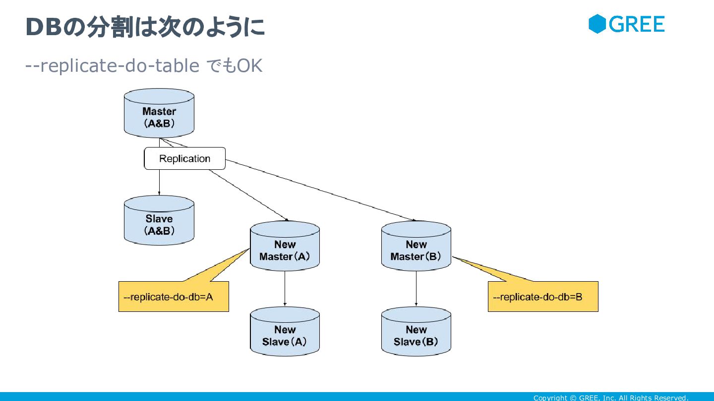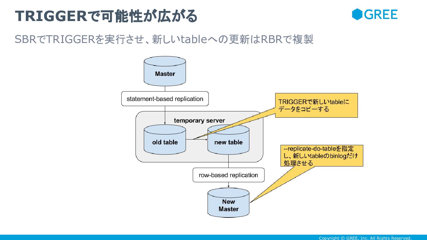 table を最初からある程度分割しておいたほうが、 -- replicate-do-db や --replicate-do-table で簡単に分割できるけど • TRIGGER 使って table を分割することもできる • binlog_format=’STATEMENT’ だと、 TRIGGER によって発生した bi は binary log に落ちないけど、 binlog_format=’ROW’ だと binary log に落ち る。それらを組み合わせることによって、 TRIGGER によって更新された table だけ replication することが可能 • サービス無停止で column の追加や削除などにも対応できるので、 statement-based replication (& --log-slave-updates)& TRIGGER の組み合わせは、切り札として有用 sharding は後からでもできる