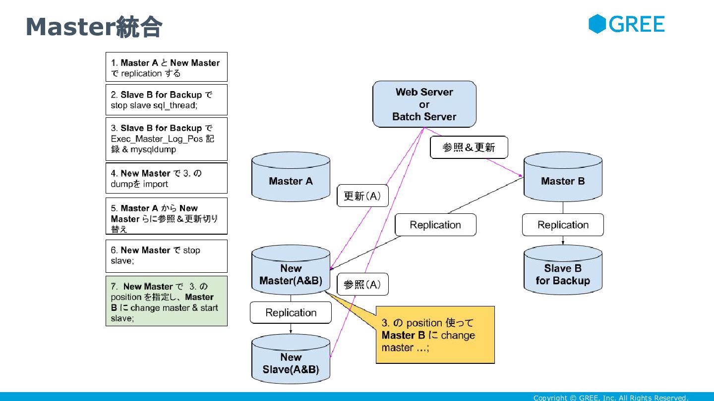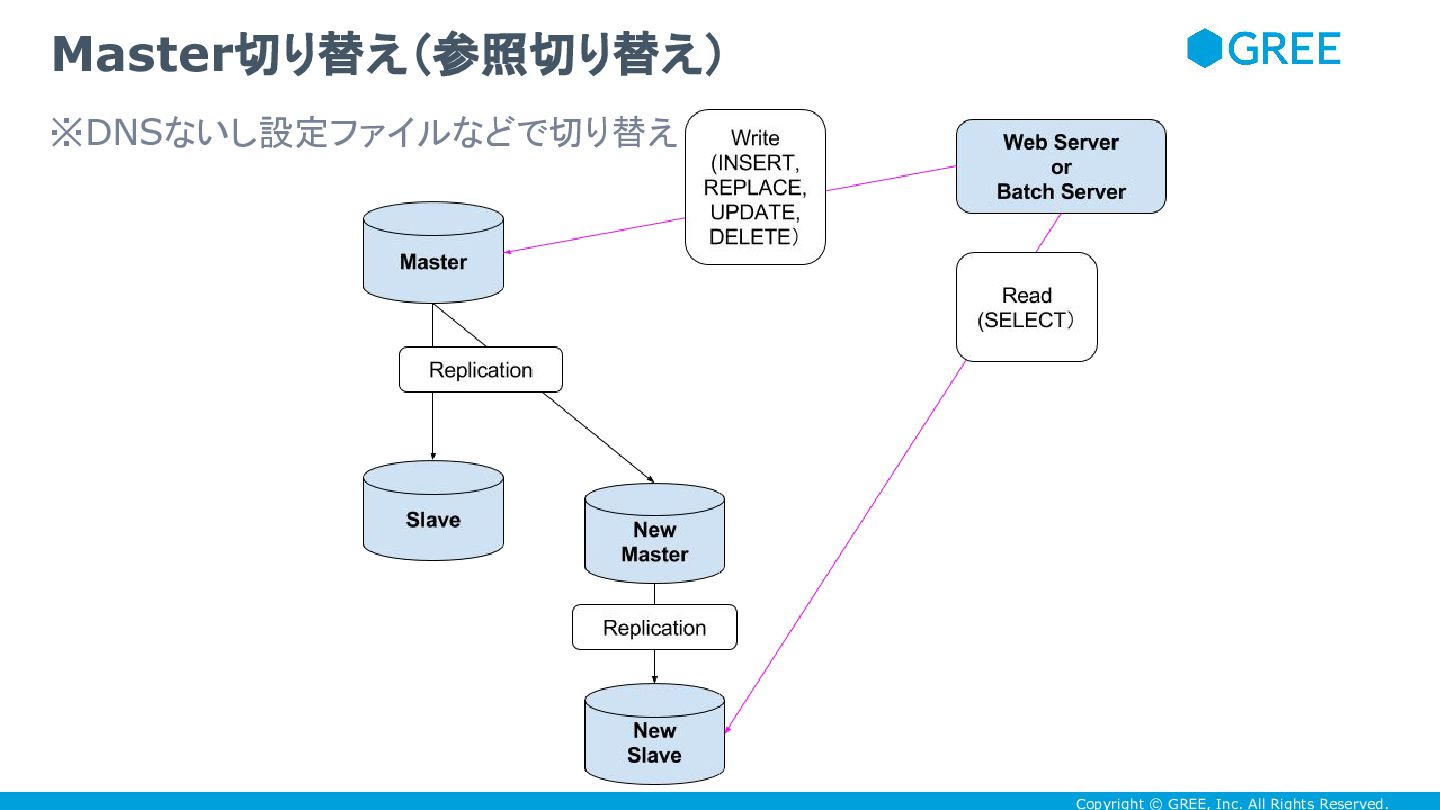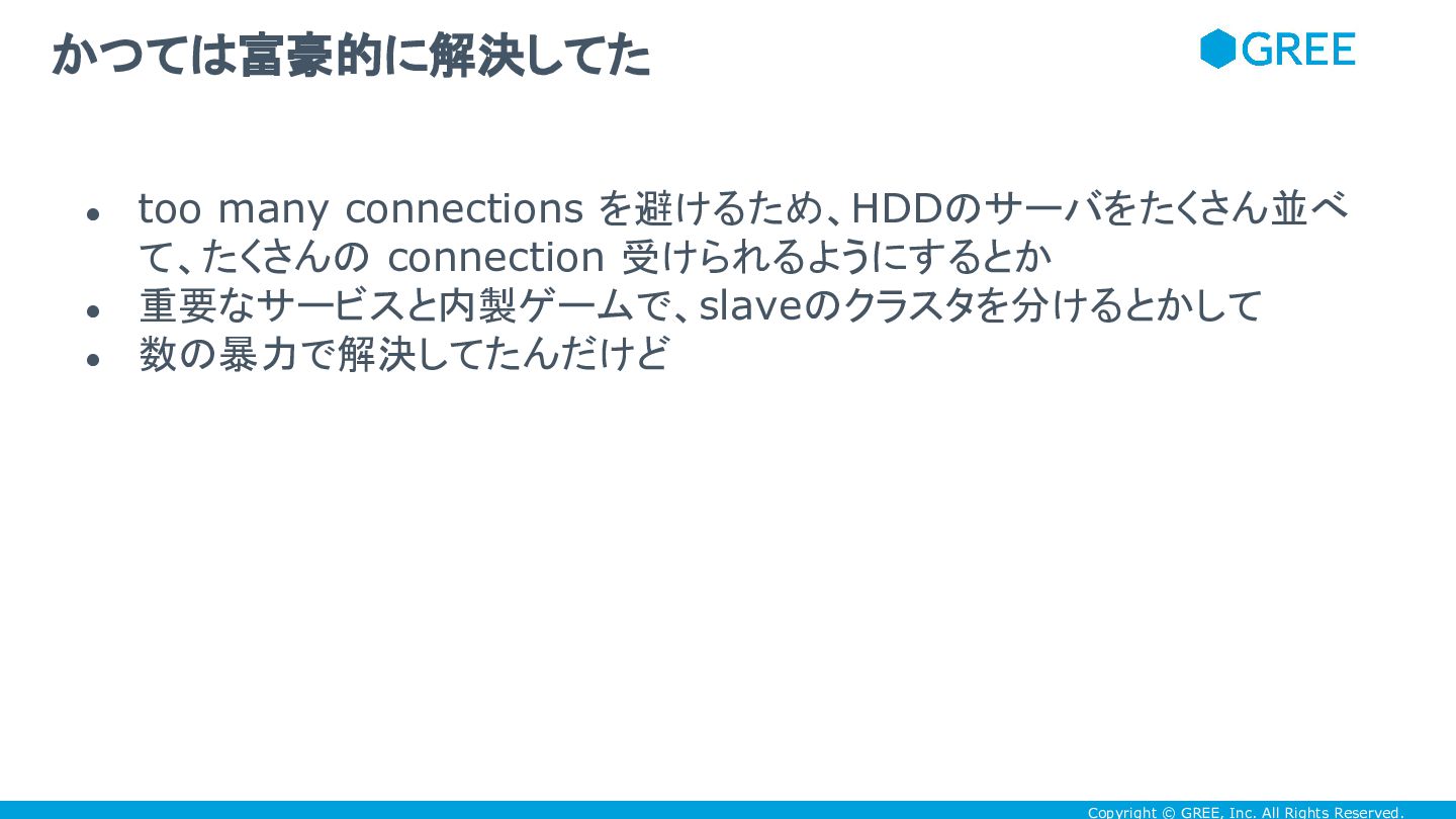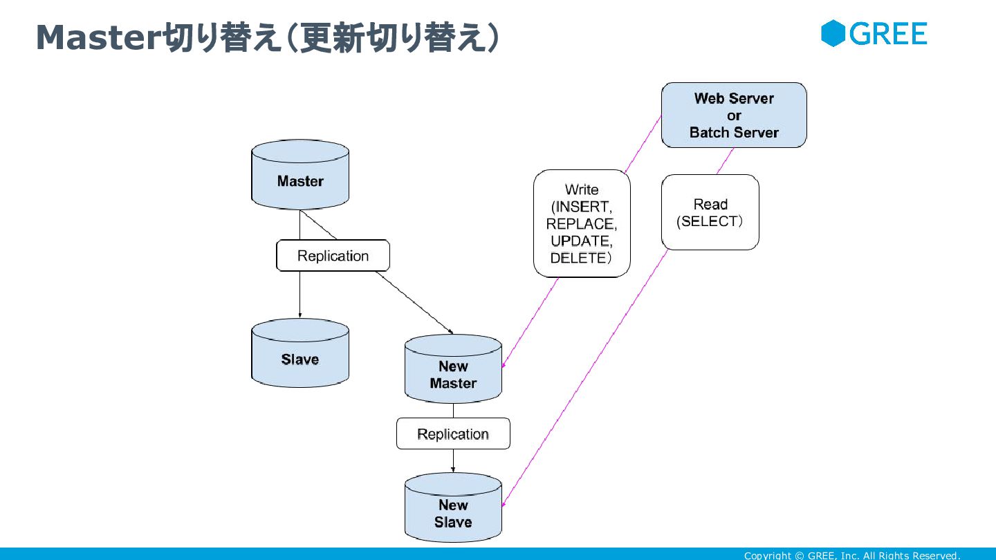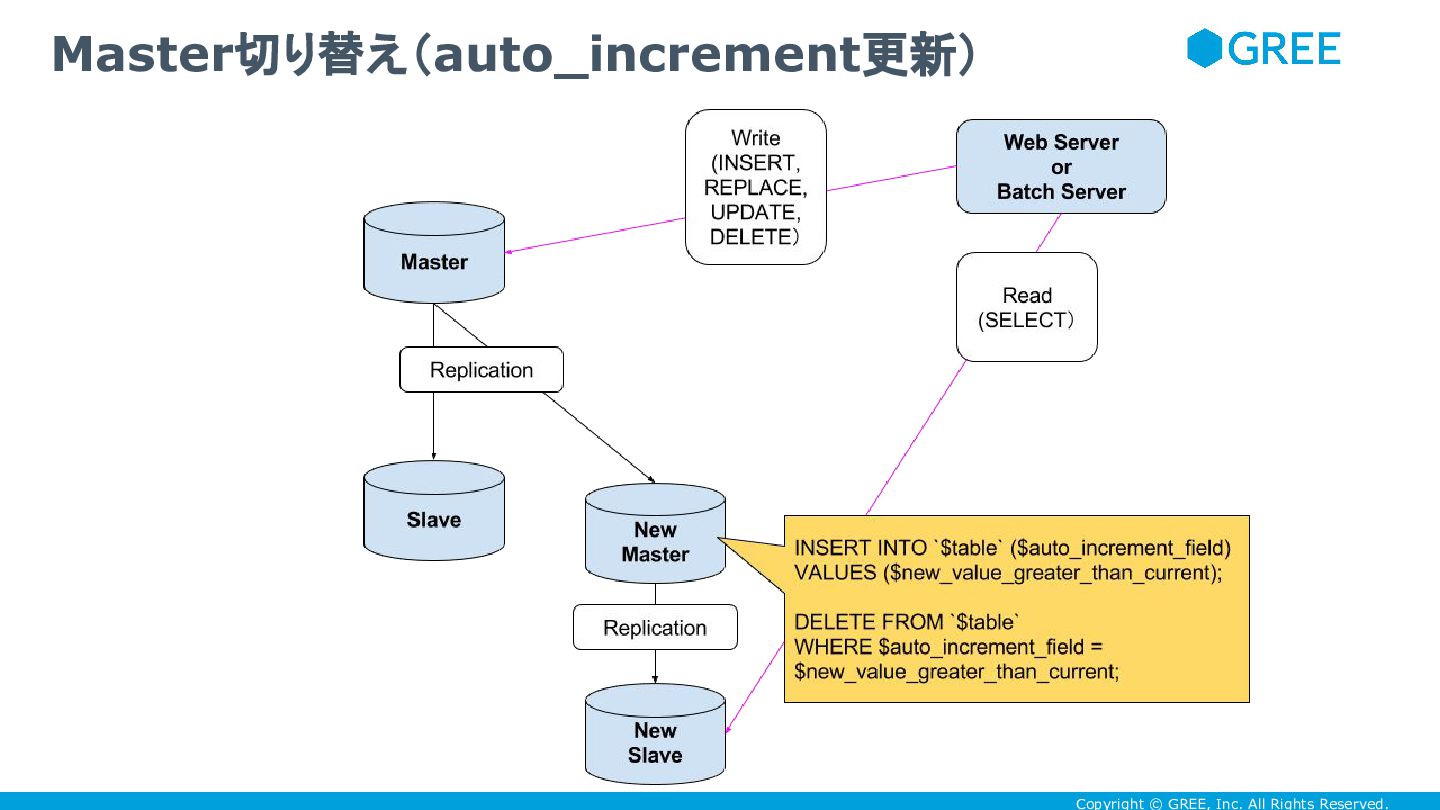 table を最初からある程度分割しておいたほうが、 -- replicate-do-db や --replicate-do-table で簡単に分割できるけど • TRIGGER 使って table を分割することもできる • binlog_format=’STATEMENT’ だと、 TRIGGER によって発生した bi は binary log に落ちないけど、 binlog_format=’ROW’ だと binary log に落ち る。それらを組み合わせることによって、 TRIGGER によって更新された table だけ replication することが可能 • サービス無停止で column の追加や削除などにも対応できるので、 statement-based replication (& --log-slave-updates)& TRIGGER の組み合わせは、切り札として有用 sharding は後からでもできる