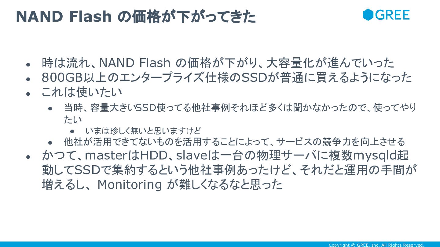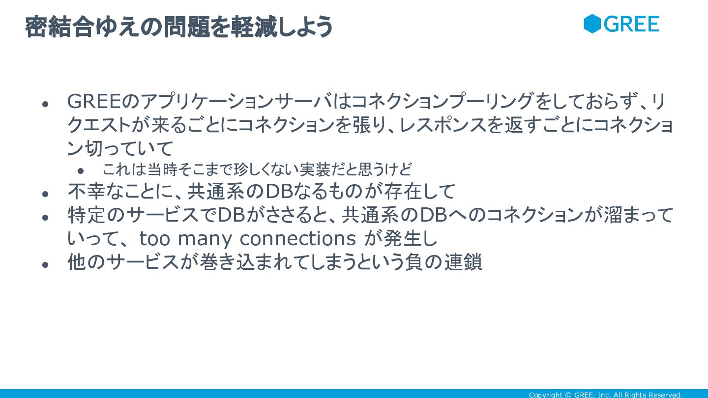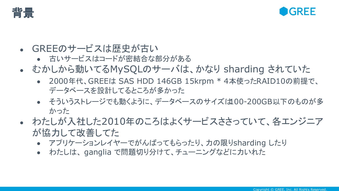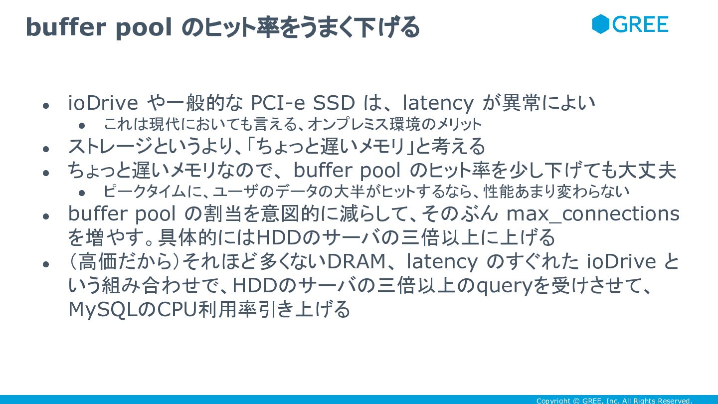 table を最初からある程度分割しておいたほうが、 -- replicate-do-db や --replicate-do-table で簡単に分割できるけど • TRIGGER 使って table を分割することもできる • binlog_format=’STATEMENT’ だと、 TRIGGER によって発生した bi は binary log に落ちないけど、 binlog_format=’ROW’ だと binary log に落ち る。それらを組み合わせることによって、 TRIGGER によって更新された table だけ replication することが可能 • サービス無停止で column の追加や削除などにも対応できるので、 statement-based replication (& --log-slave-updates)& TRIGGER の組み合わせは、切り札として有用 sharding は後からでもできる