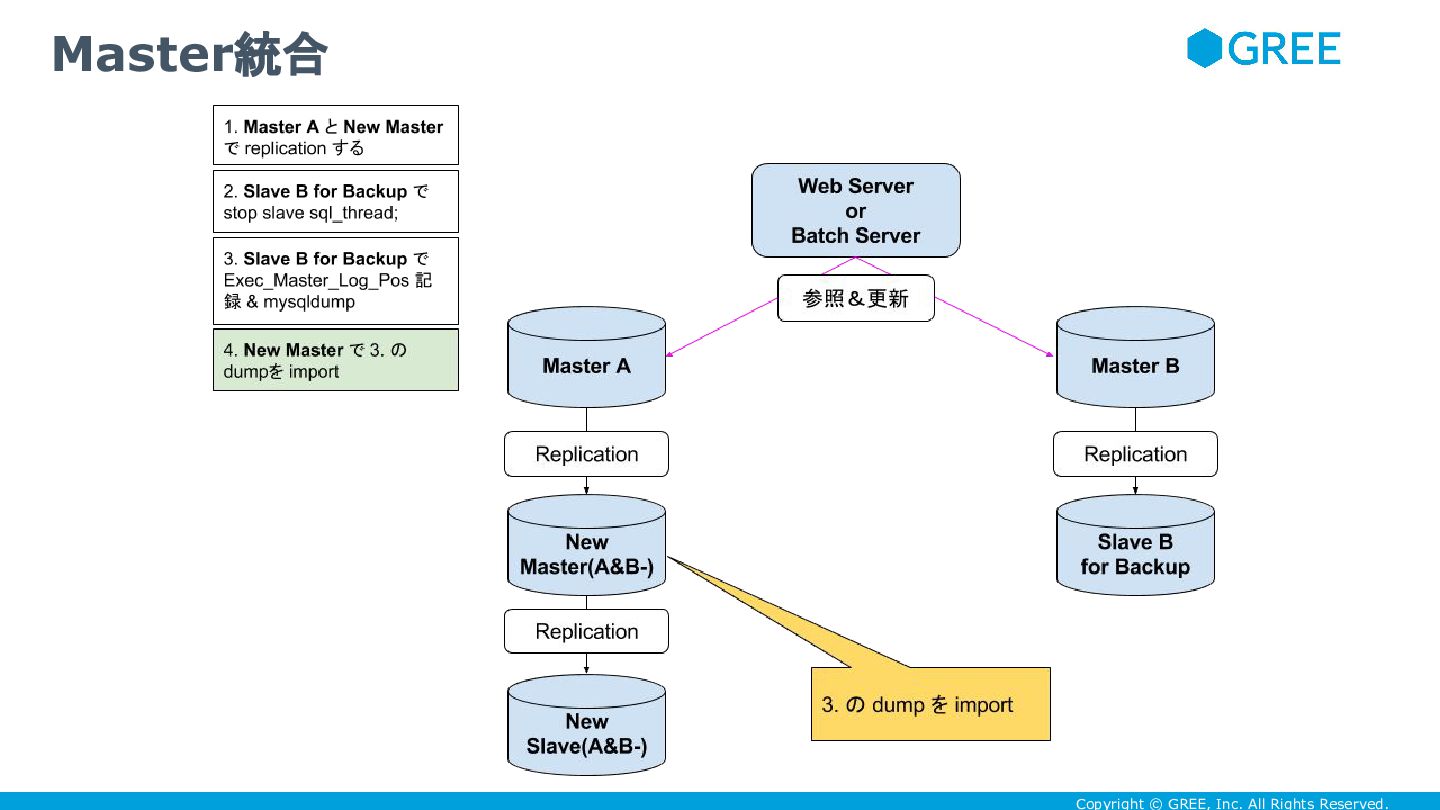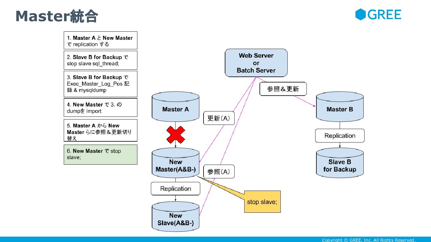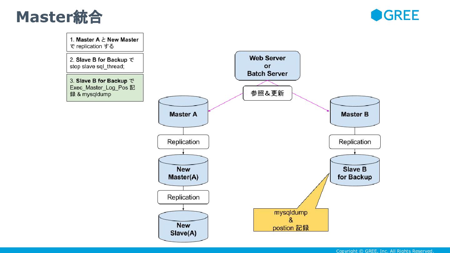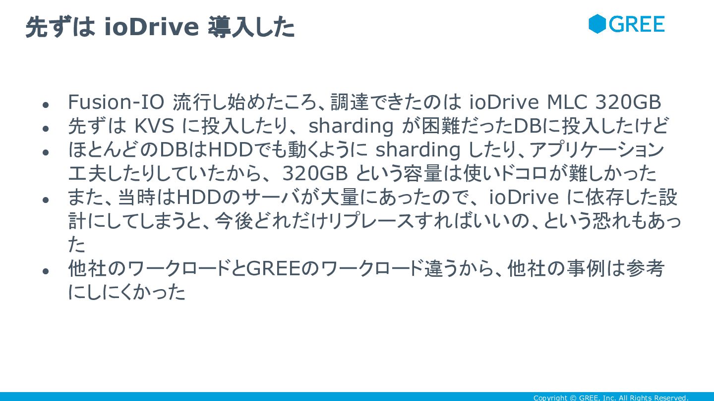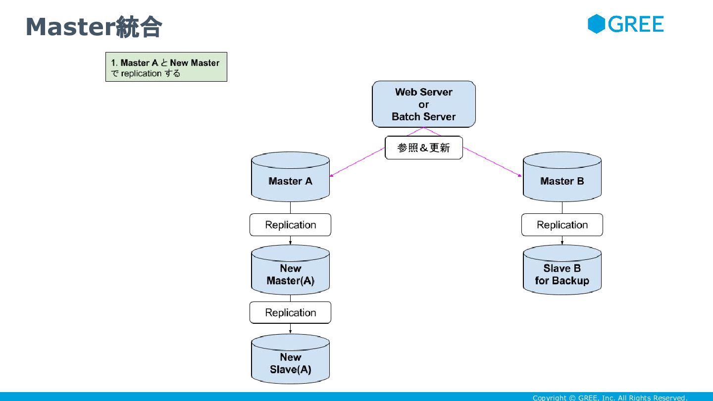 table を最初からある程度分割しておいたほうが、 -- replicate-do-db や --replicate-do-table で簡単に分割できるけど • TRIGGER 使って table を分割することもできる • binlog_format=’STATEMENT’ だと、 TRIGGER によって発生した bi は binary log に落ちないけど、 binlog_format=’ROW’ だと binary log に落ち る。それらを組み合わせることによって、 TRIGGER によって更新された table だけ replication することが可能 • サービス無停止で column の追加や削除などにも対応できるので、 statement-based replication (& --log-slave-updates)& TRIGGER の組み合わせは、切り札として有用 sharding は後からでもできる
