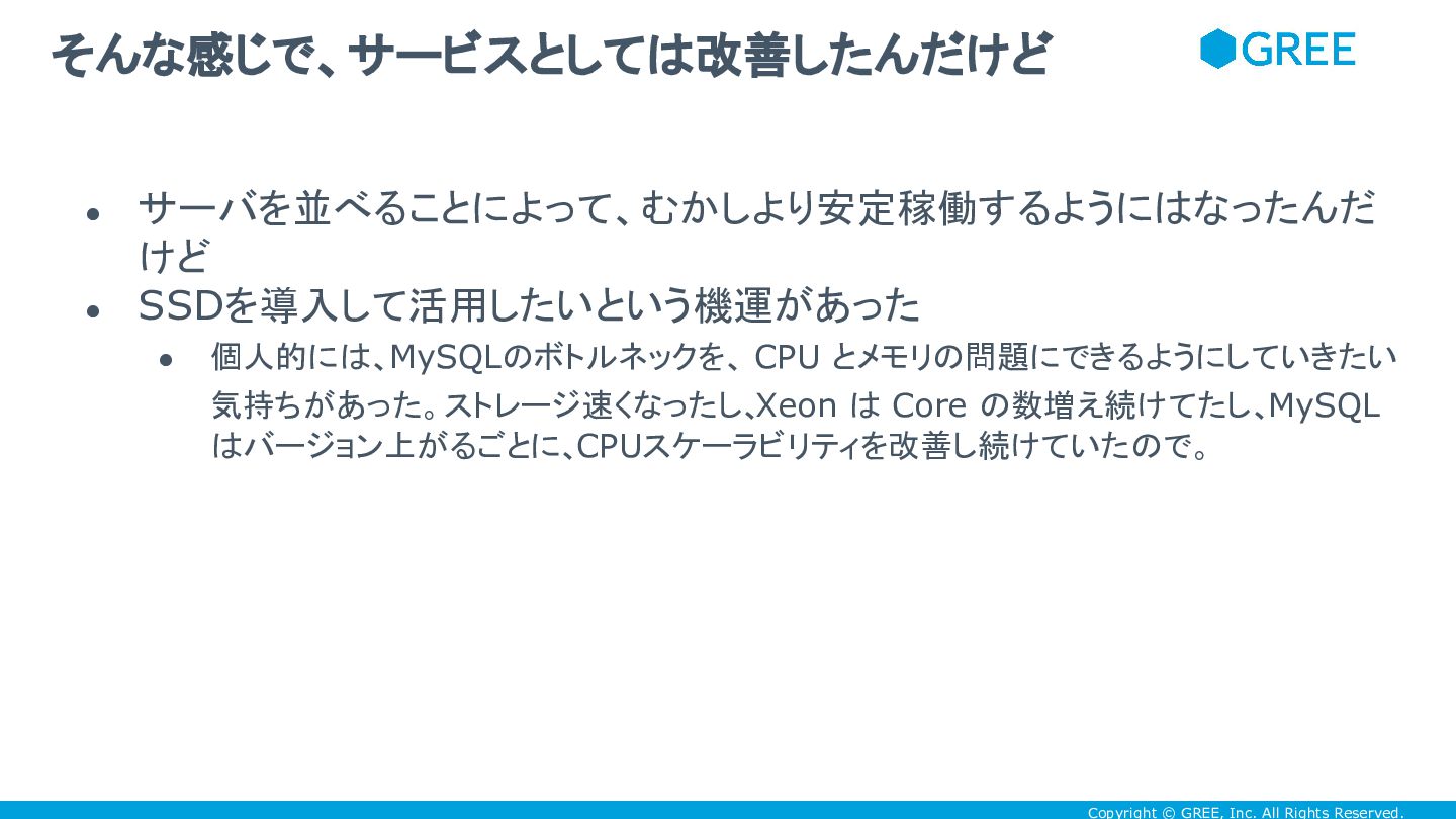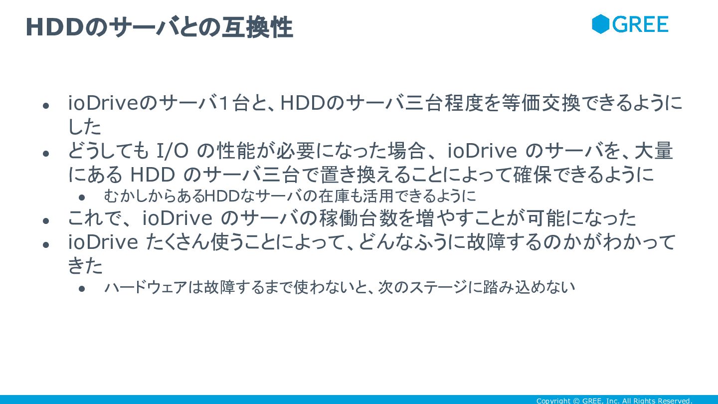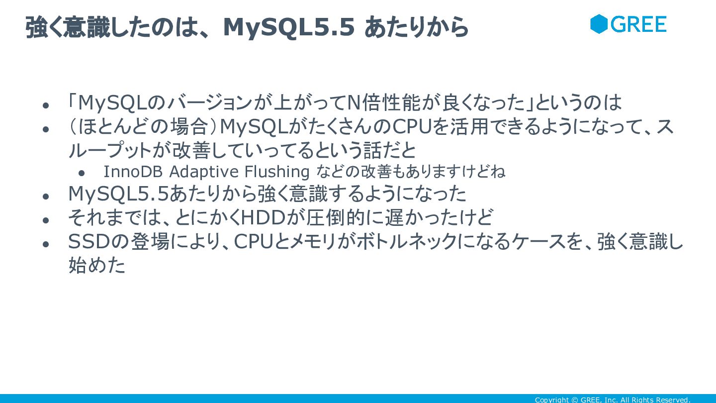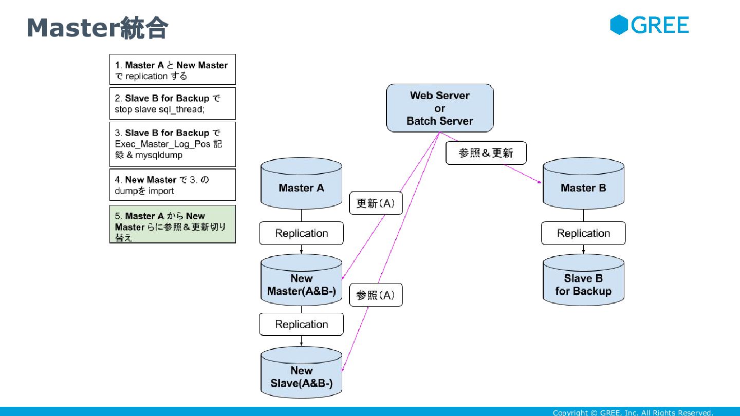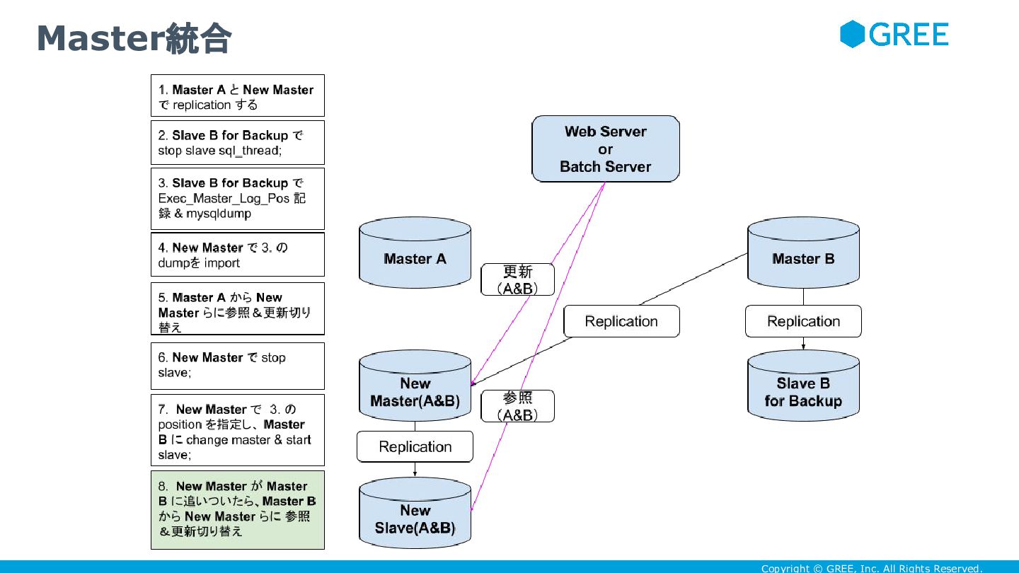 table を最初からある程度分割しておいたほうが、 -- replicate-do-db や --replicate-do-table で簡単に分割できるけど • TRIGGER 使って table を分割することもできる • binlog_format=’STATEMENT’ だと、 TRIGGER によって発生した bi は binary log に落ちないけど、 binlog_format=’ROW’ だと binary log に落ち る。それらを組み合わせることによって、 TRIGGER によって更新された table だけ replication することが可能 • サービス無停止で column の追加や削除などにも対応できるので、 statement-based replication (& --log-slave-updates)& TRIGGER の組み合わせは、切り札として有用 sharding は後からでもできる
