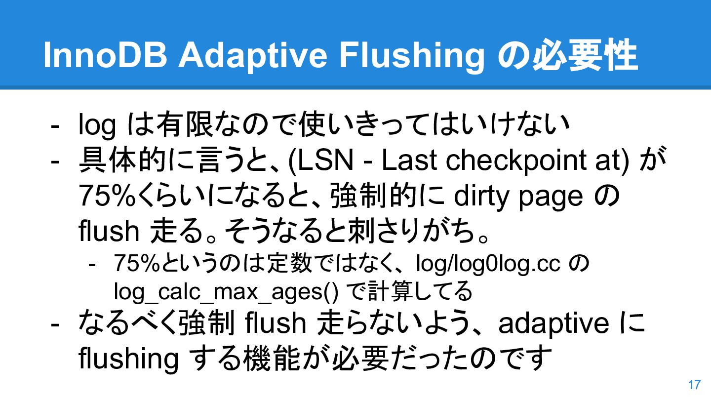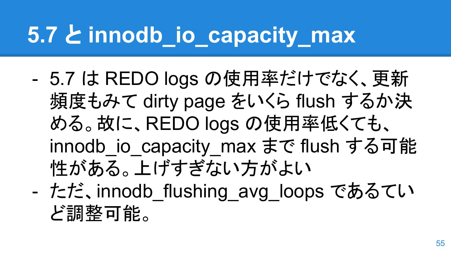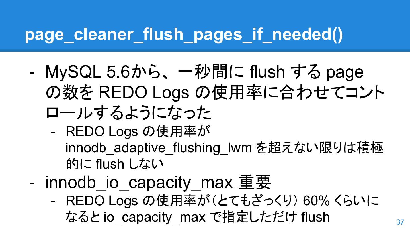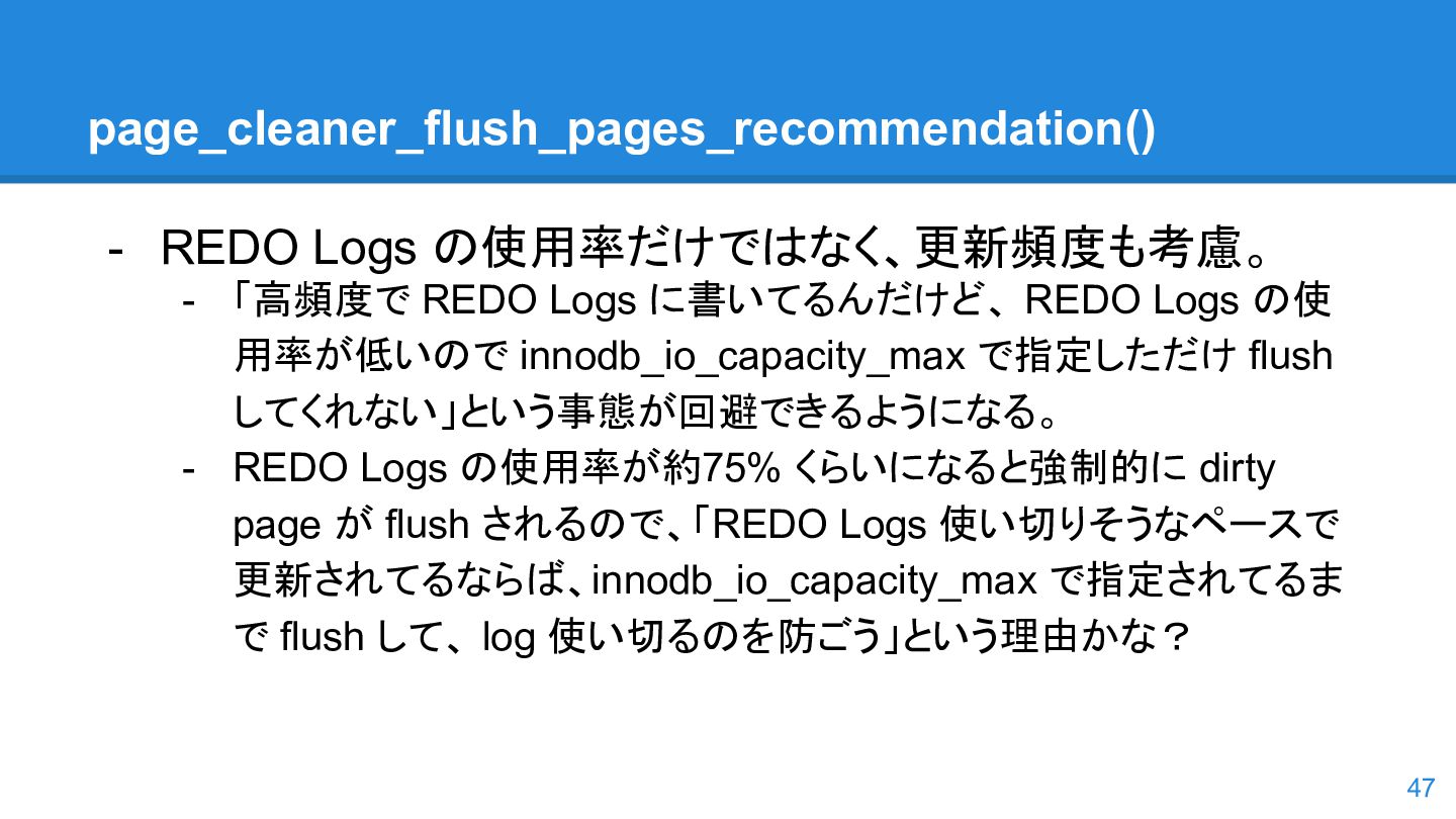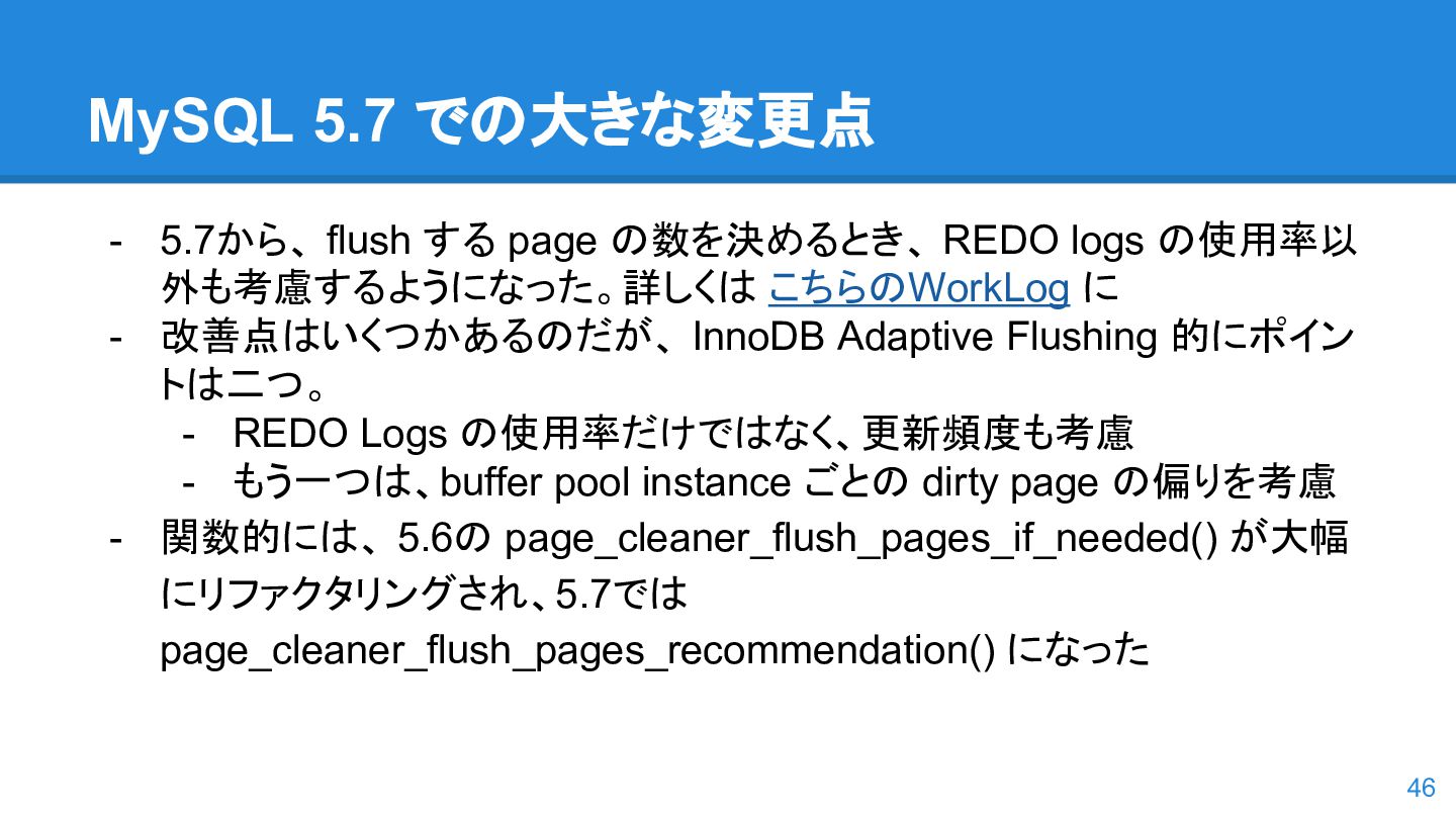logs の使用率以 外も考慮するようになった。詳しくは こちらのWorkLog に - 改善点はいくつかあるのだが、 InnoDB Adaptive Flushing 的にポイン トは二つ。 - REDO Logs の使用率だけではなく、更新頻度も考慮 - もう一つは、buffer pool instance ごとの dirty page の偏りを考慮 - 関数的には、 5.6の page_cleaner_flush_pages_if_needed() が大幅 にリファクタリングされ、5.7では page_cleaner_flush_pages_recommendation() になった 46