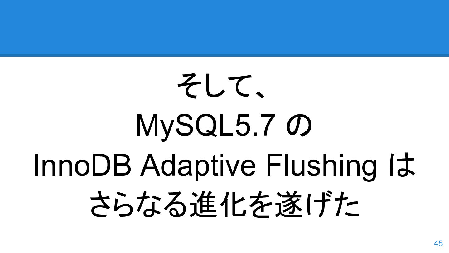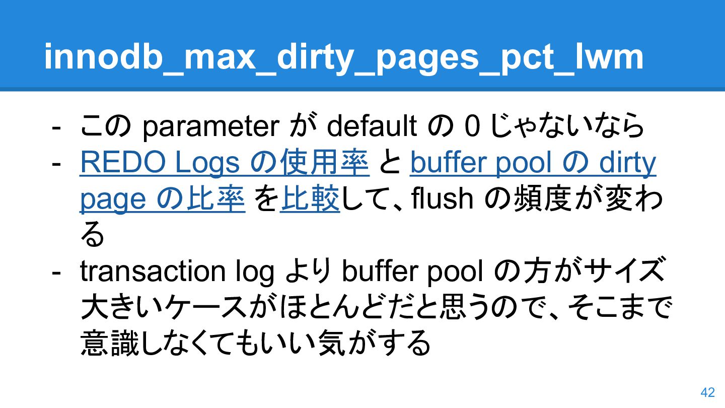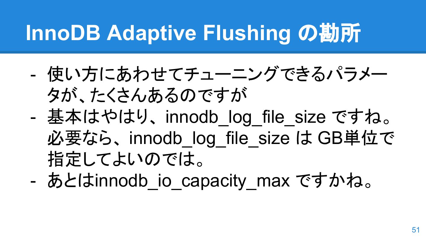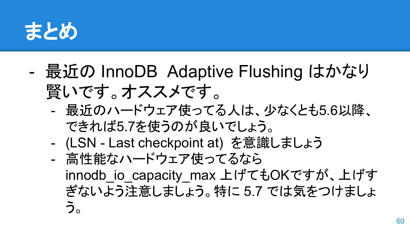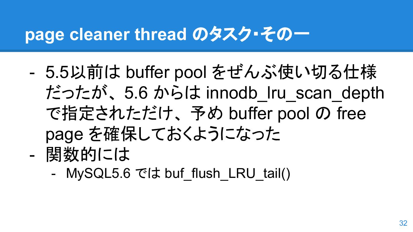 logs の使用率以 外も考慮するようになった。詳しくは こちらのWorkLog に - 改善点はいくつかあるのだが、 InnoDB Adaptive Flushing 的にポイン トは二つ。 - REDO Logs の使用率だけではなく、更新頻度も考慮 - もう一つは、buffer pool instance ごとの dirty page の偏りを考慮 - 関数的には、 5.6の page_cleaner_flush_pages_if_needed() が大幅 にリファクタリングされ、5.7では page_cleaner_flush_pages_recommendation() になった 46