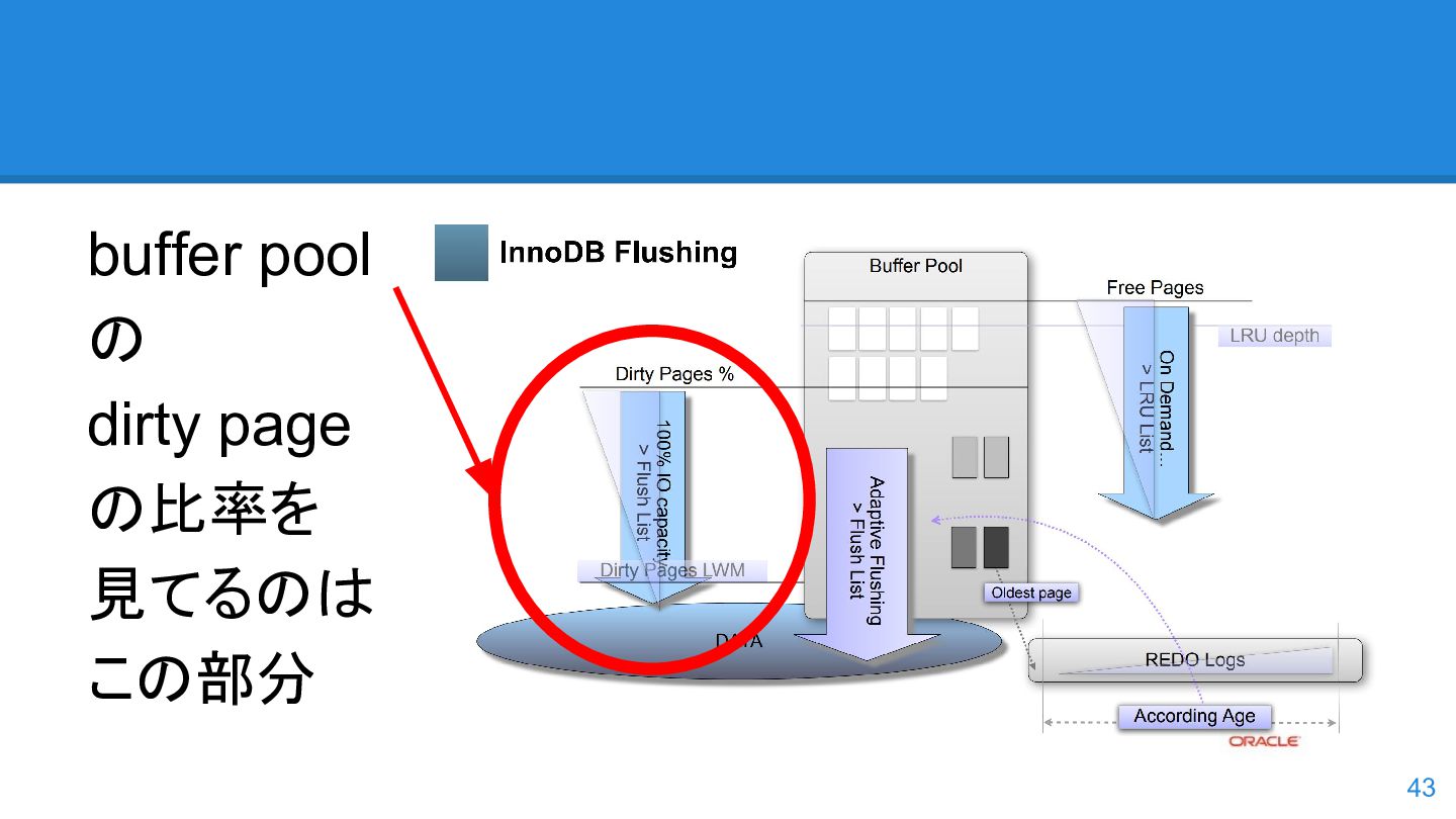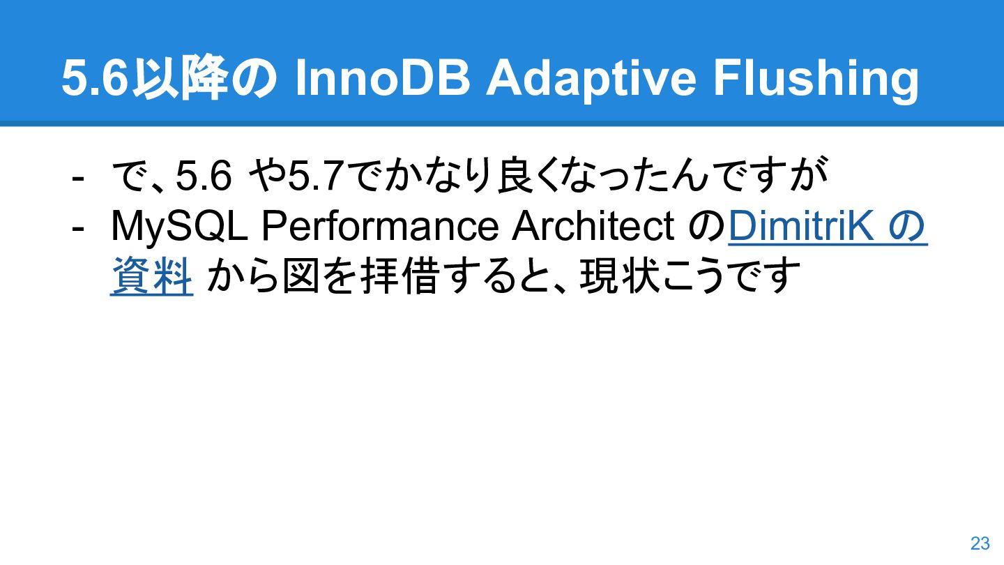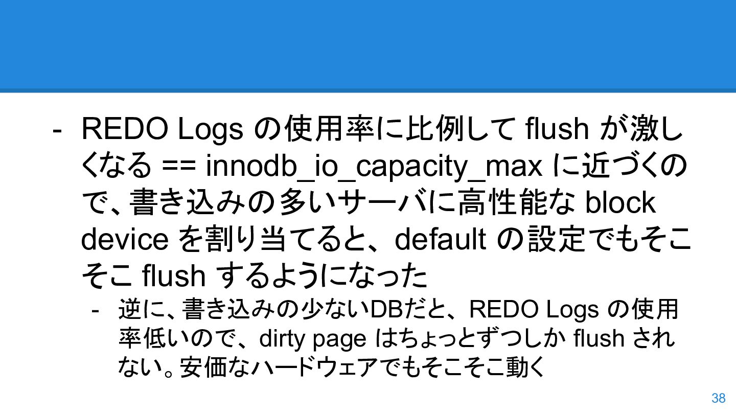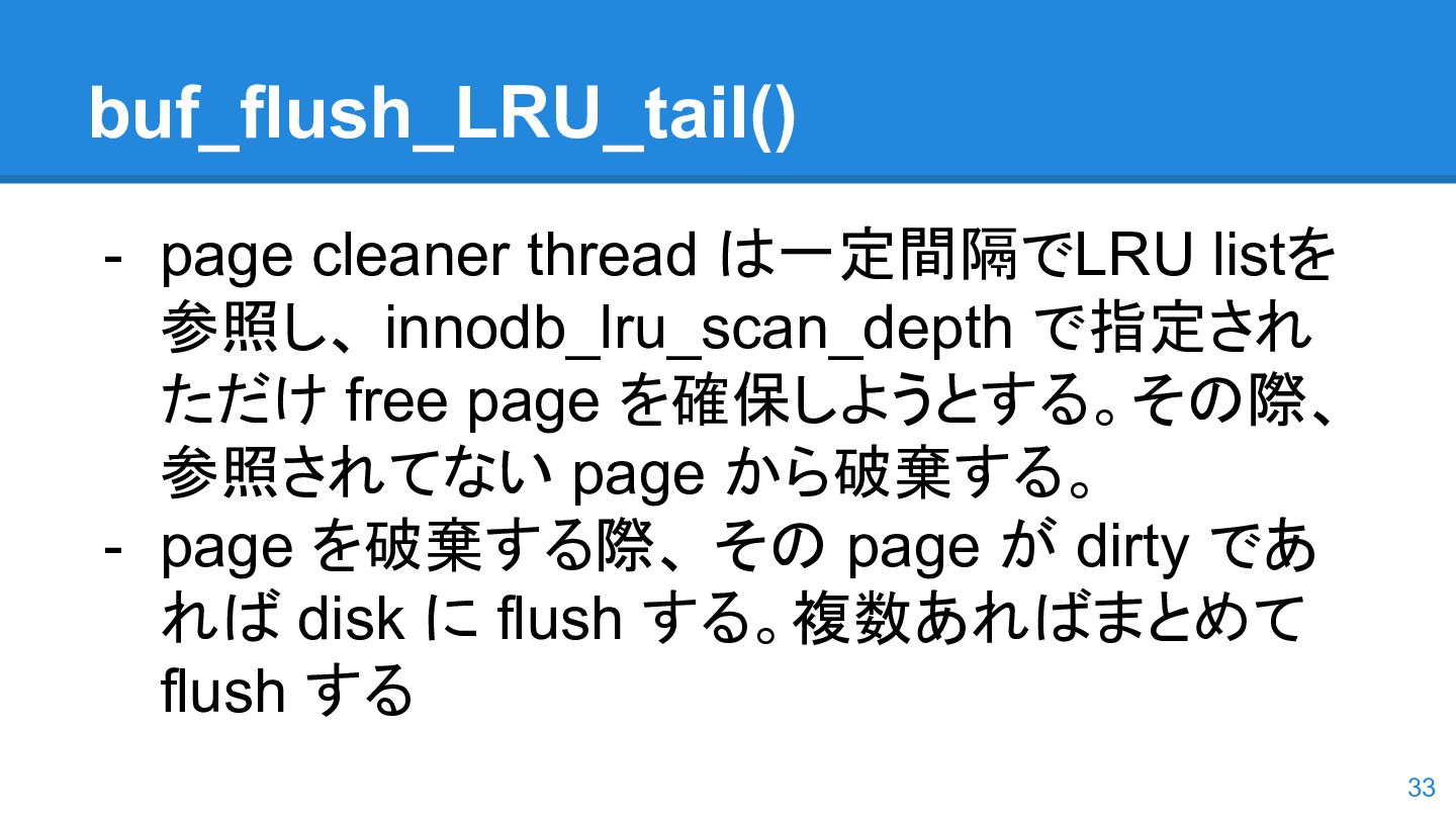 logs の使用率以 外も考慮するようになった。詳しくは こちらのWorkLog に - 改善点はいくつかあるのだが、 InnoDB Adaptive Flushing 的にポイン トは二つ。 - REDO Logs の使用率だけではなく、更新頻度も考慮 - もう一つは、buffer pool instance ごとの dirty page の偏りを考慮 - 関数的には、 5.6の page_cleaner_flush_pages_if_needed() が大幅 にリファクタリングされ、5.7では page_cleaner_flush_pages_recommendation() になった 46