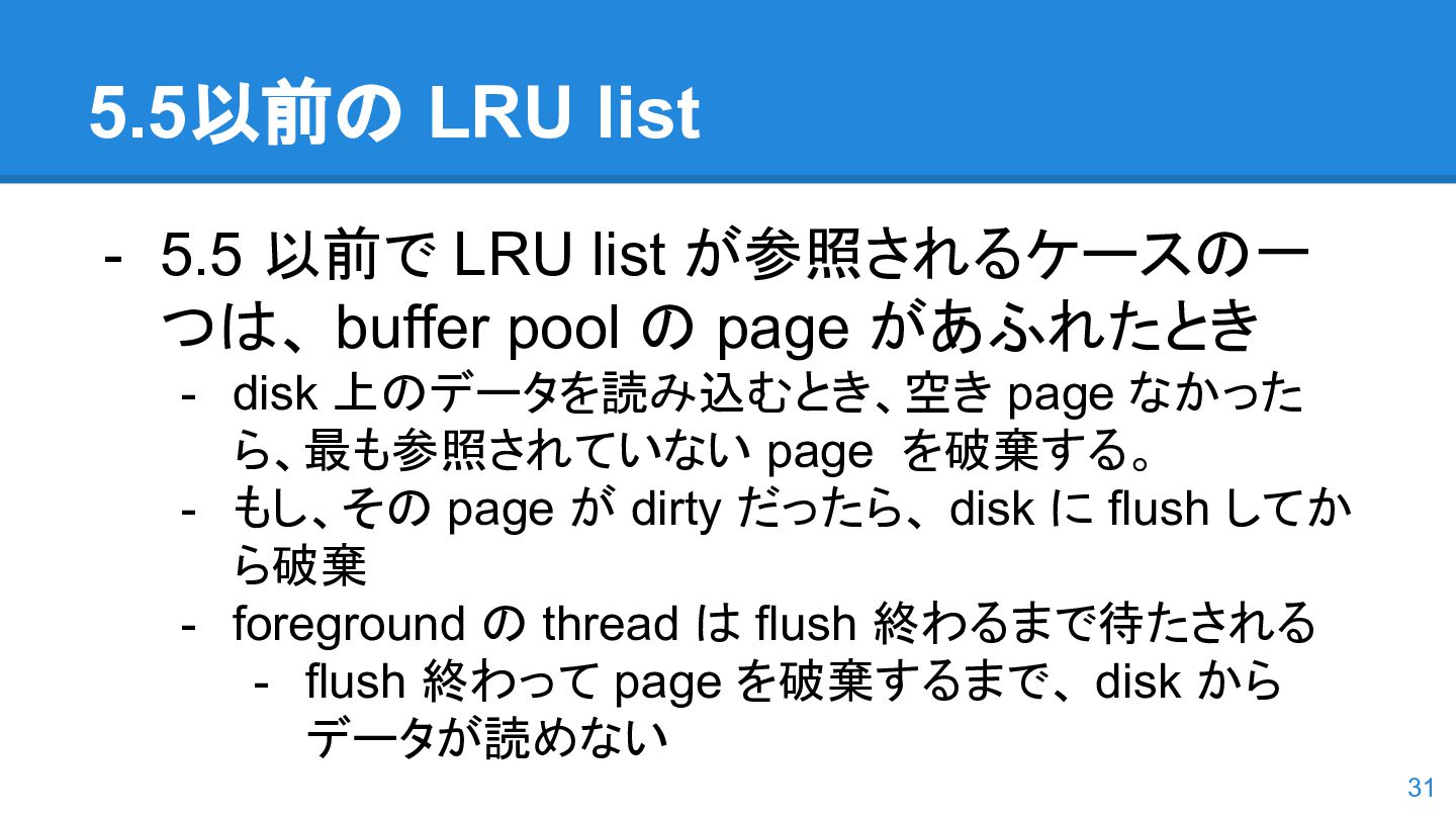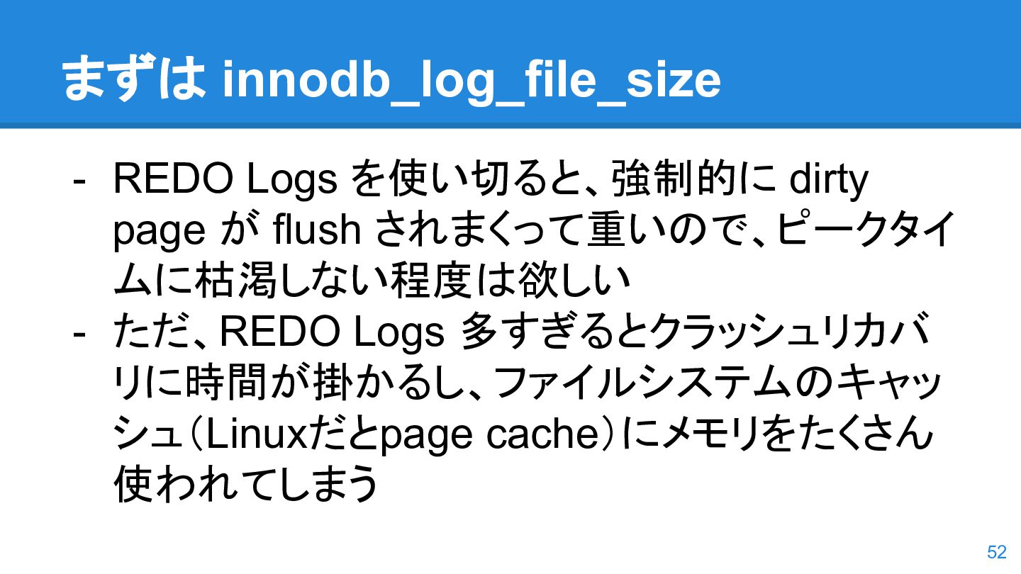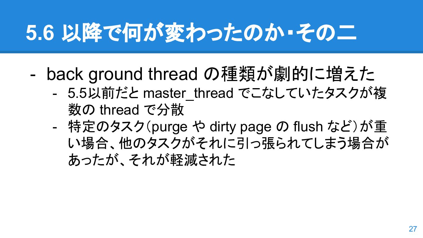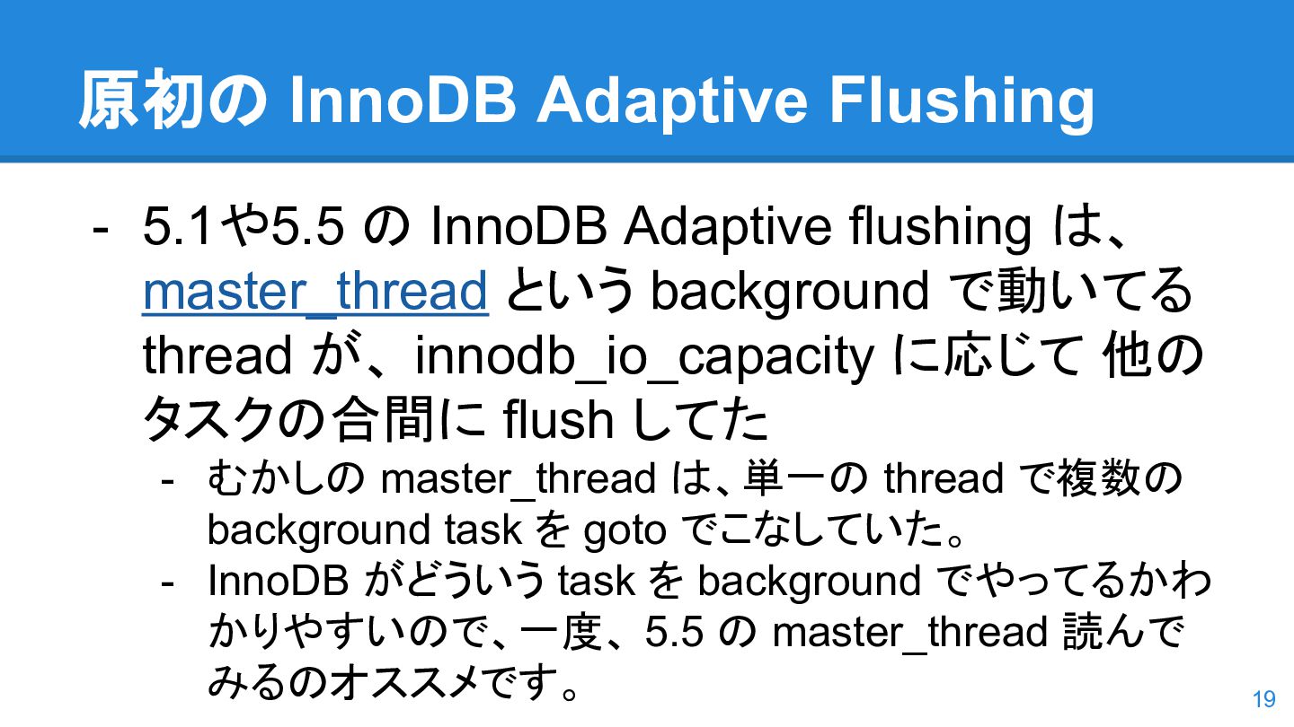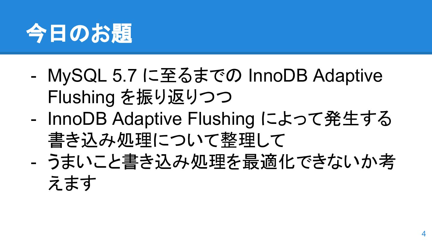 logs の使用率以 外も考慮するようになった。詳しくは こちらのWorkLog に - 改善点はいくつかあるのだが、 InnoDB Adaptive Flushing 的にポイン トは二つ。 - REDO Logs の使用率だけではなく、更新頻度も考慮 - もう一つは、buffer pool instance ごとの dirty page の偏りを考慮 - 関数的には、 5.6の page_cleaner_flush_pages_if_needed() が大幅 にリファクタリングされ、5.7では page_cleaner_flush_pages_recommendation() になった 46