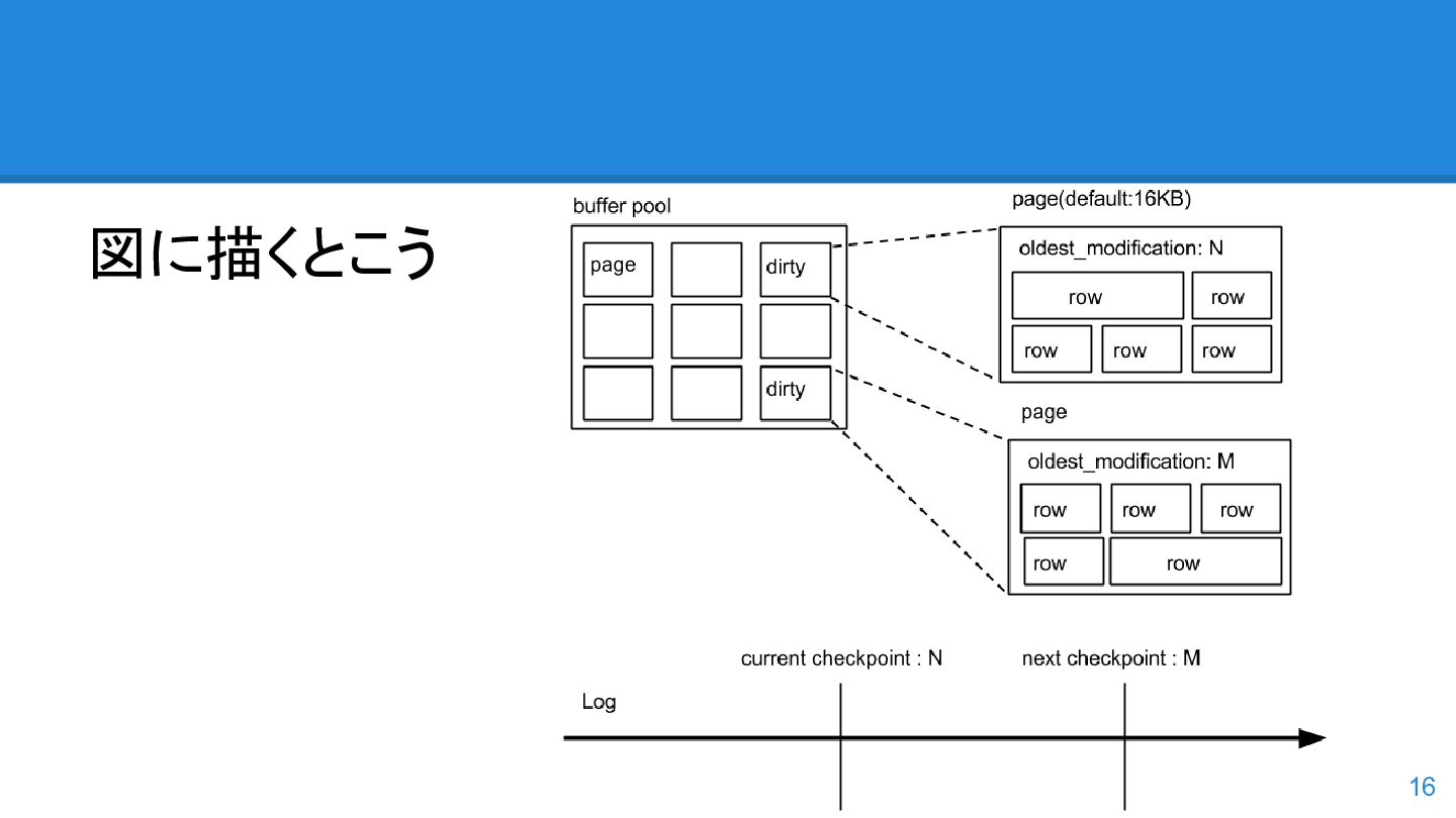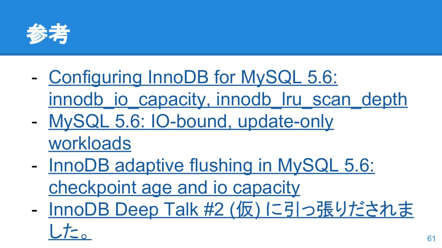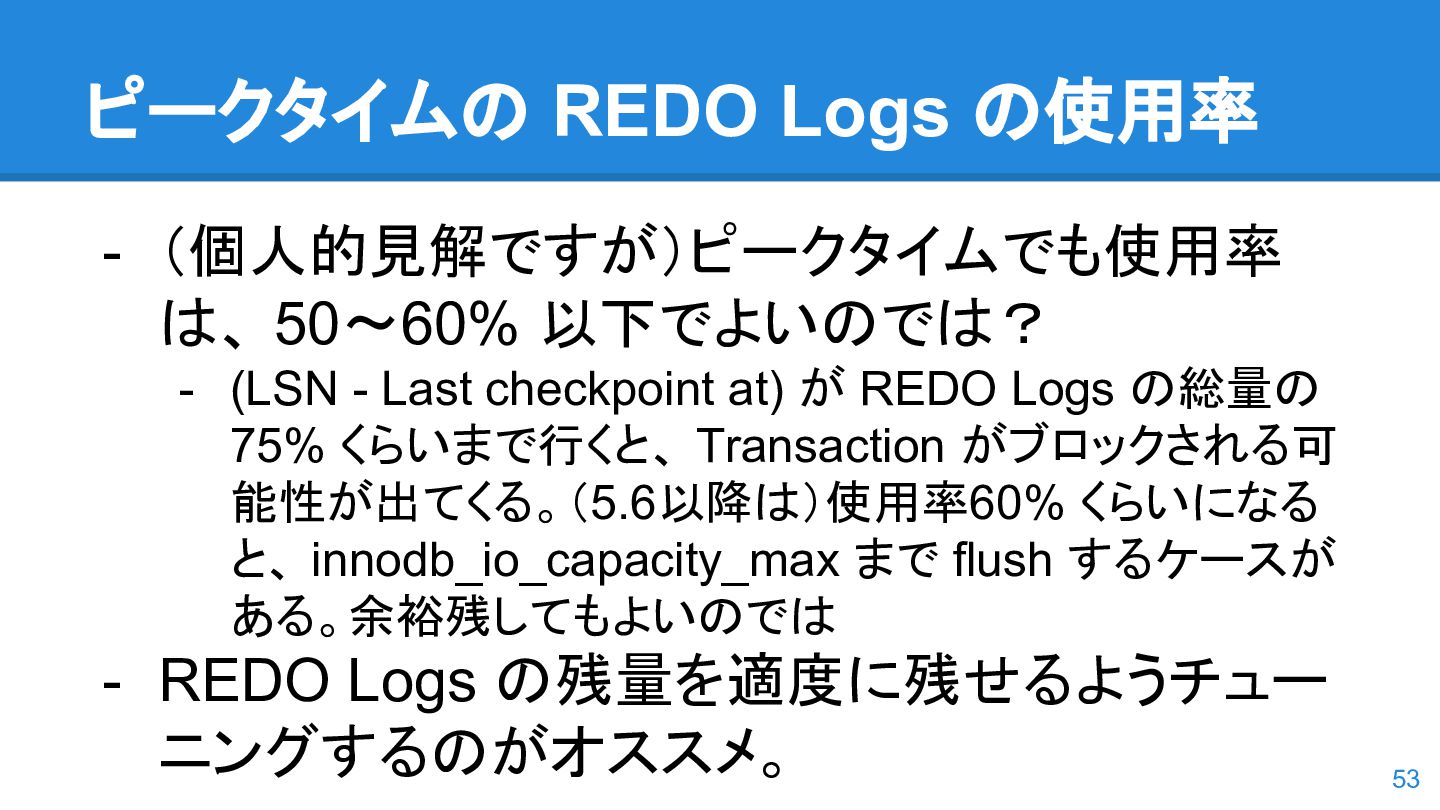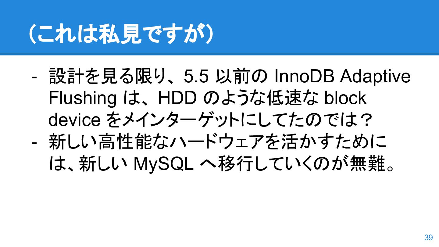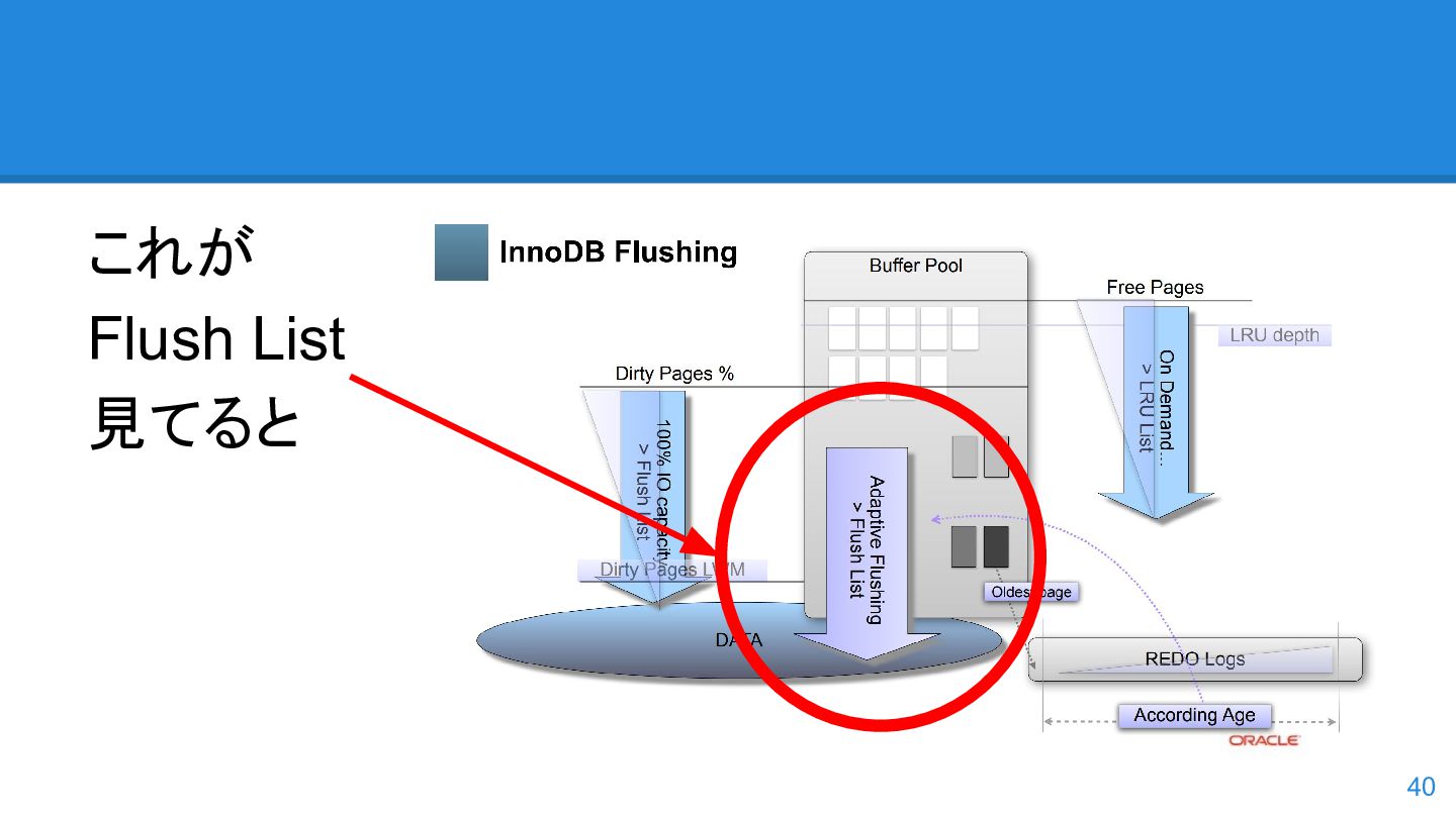 logs の使用率以 外も考慮するようになった。詳しくは こちらのWorkLog に - 改善点はいくつかあるのだが、 InnoDB Adaptive Flushing 的にポイン トは二つ。 - REDO Logs の使用率だけではなく、更新頻度も考慮 - もう一つは、buffer pool instance ごとの dirty page の偏りを考慮 - 関数的には、 5.6の page_cleaner_flush_pages_if_needed() が大幅 にリファクタリングされ、5.7では page_cleaner_flush_pages_recommendation() になった 46