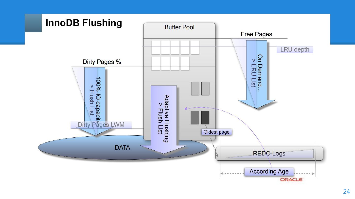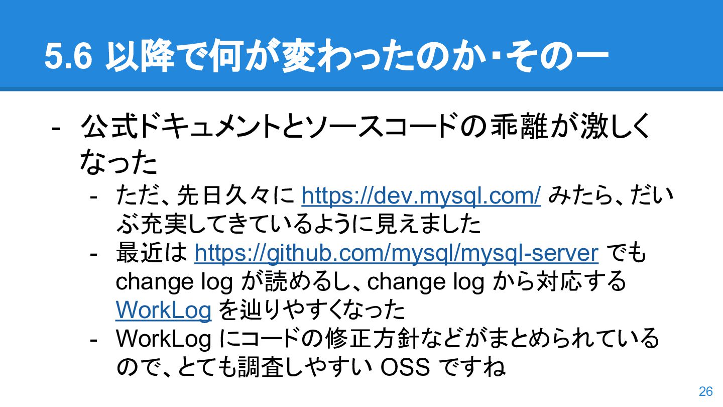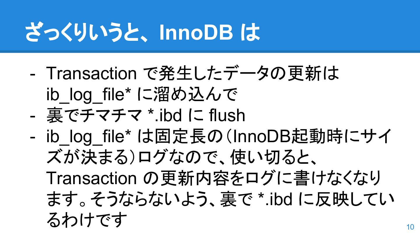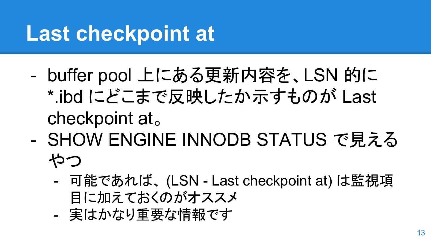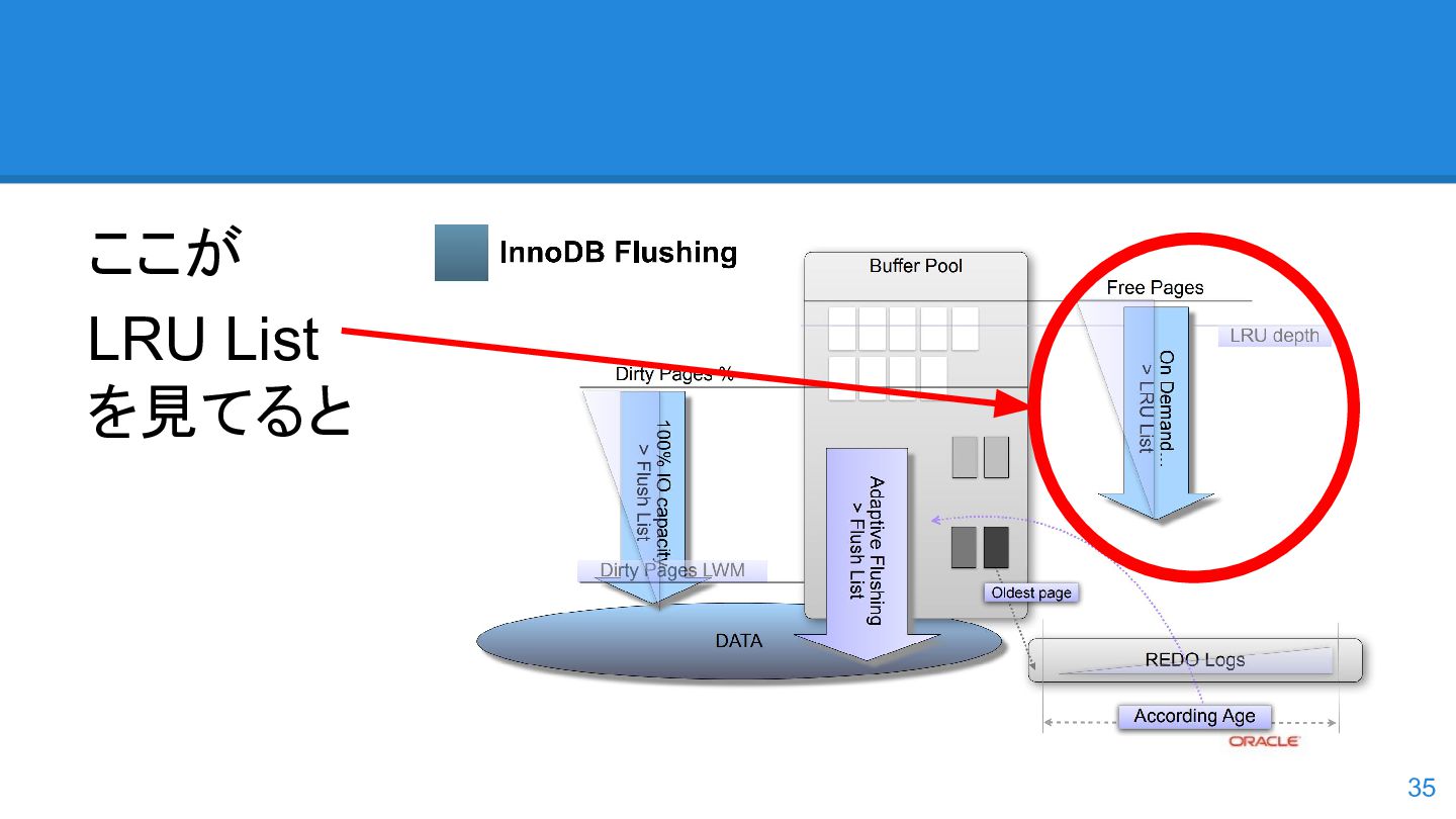 logs の使用率以 外も考慮するようになった。詳しくは こちらのWorkLog に - 改善点はいくつかあるのだが、 InnoDB Adaptive Flushing 的にポイン トは二つ。 - REDO Logs の使用率だけではなく、更新頻度も考慮 - もう一つは、buffer pool instance ごとの dirty page の偏りを考慮 - 関数的には、 5.6の page_cleaner_flush_pages_if_needed() が大幅 にリファクタリングされ、5.7では page_cleaner_flush_pages_recommendation() になった 46