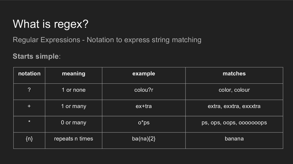 matching Starts simple: notation meaning example matches ? 1 or none colou?r color, colour + 1 or many ex+tra extra, exxtra, exxxtra * 0 or many o*ps ps, ops, oops, ooooooops {n} repeats n times ba(na){2} banana
