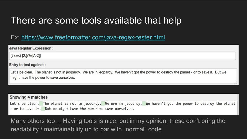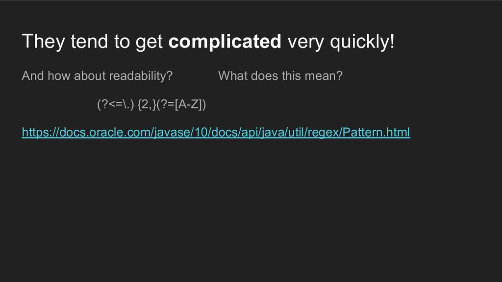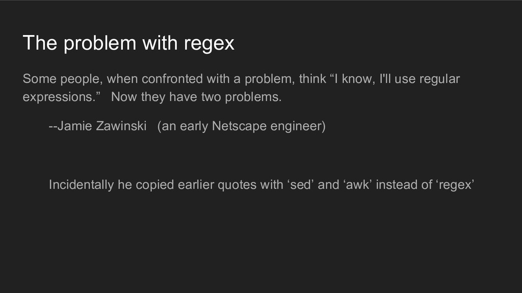 problem, think “I know, I'll use regular expressions.” Now they have two problems. --Jamie Zawinski (an early Netscape engineer) Incidentally he copied earlier quotes with ‘sed’ and ‘awk’ instead of ‘regex’