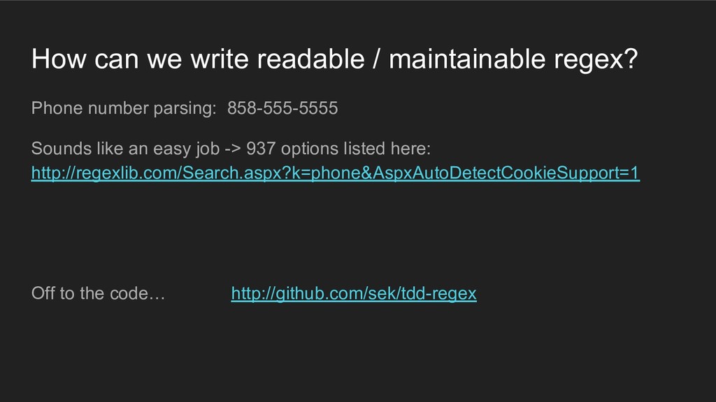 parsing: 858-555-5555 Sounds like an easy job -> 937 options listed here: http://regexlib.com/Search.aspx?k=phone&AspxAutoDetectCookieSupport=1 Off to the code… http://github.com/sek/tdd-regex
