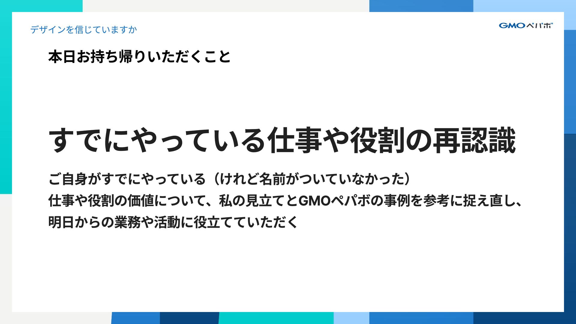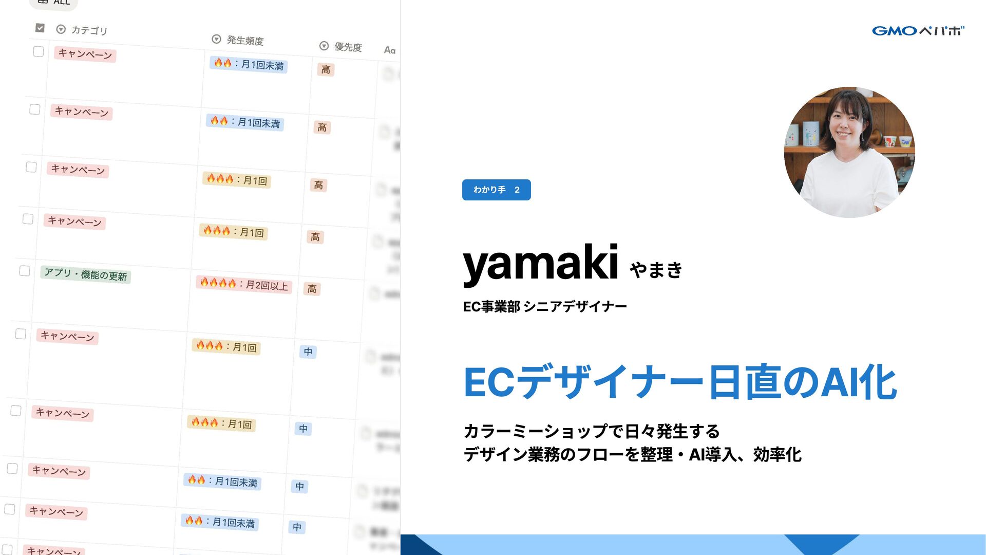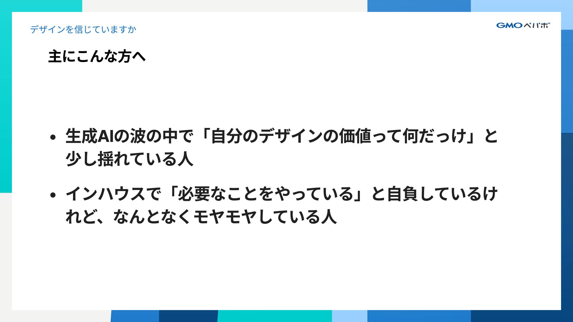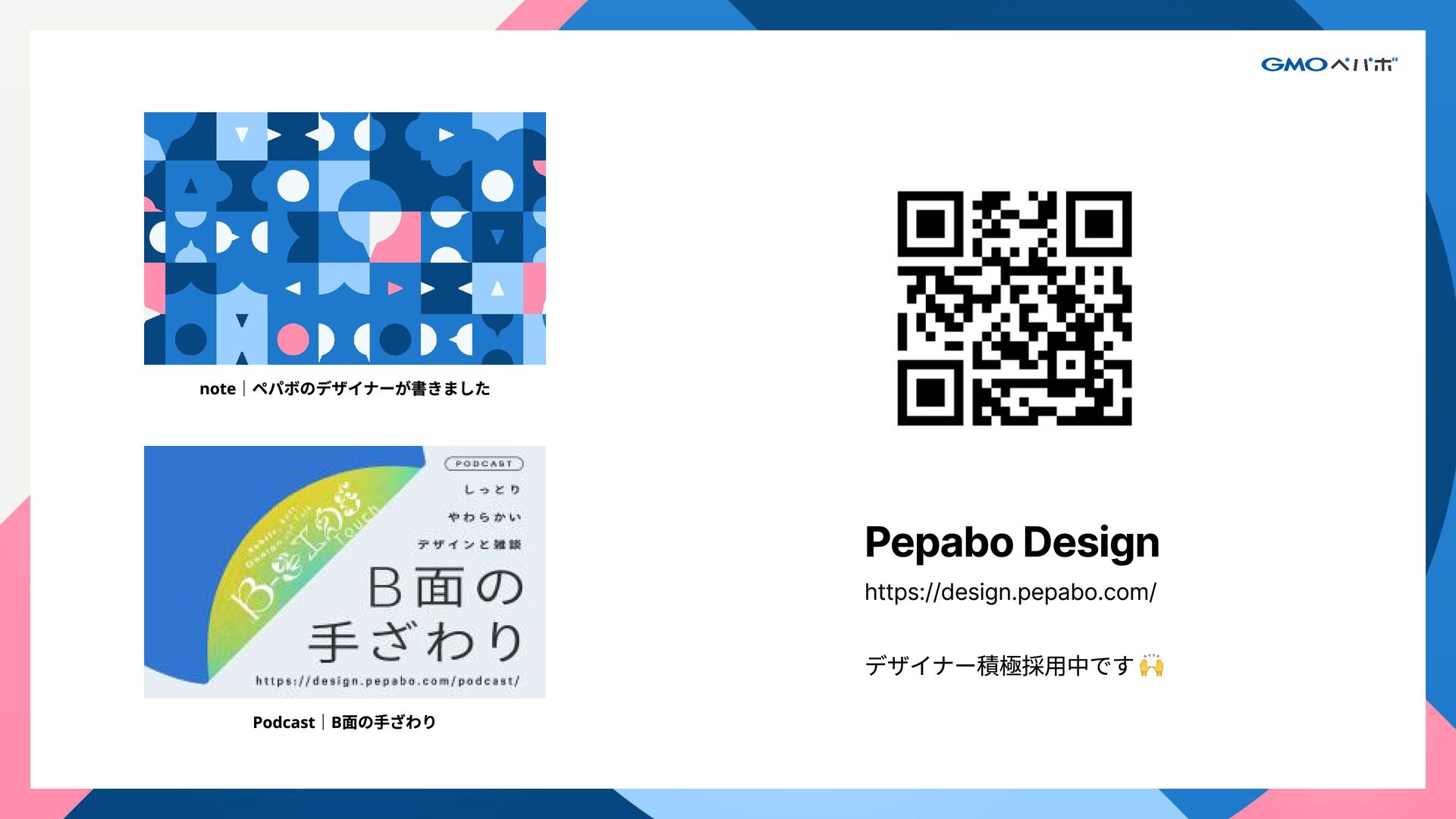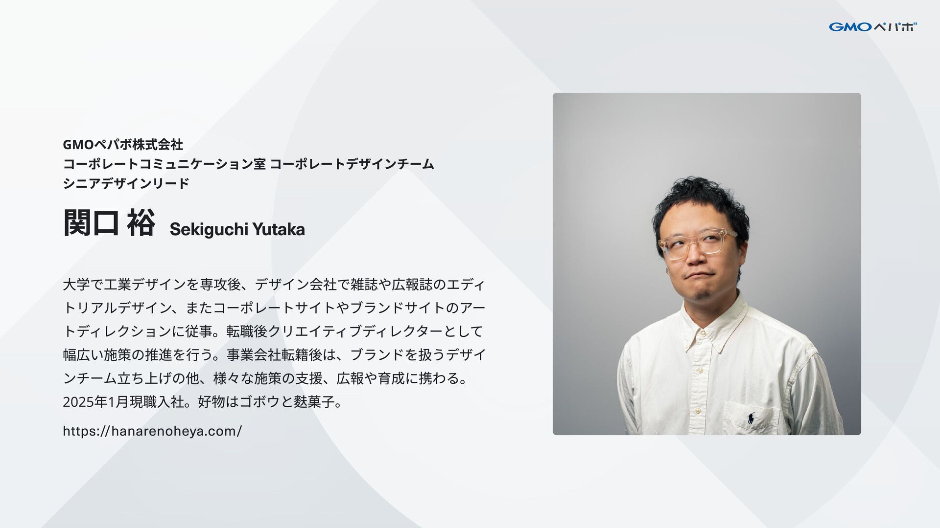 1. GMOペパボ株式会社 コーポレートコミュニケーション室 コーポレートデザインチーム シニアデザインリード 関口 裕 Sekiguchi Yutaka 大学で工業デザインを専攻後、デザイン会社で雑誌や広報誌のエディ トリアルデザイン、またコーポレートサイトやブランドサイトのアー